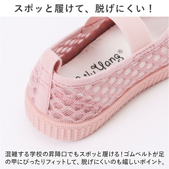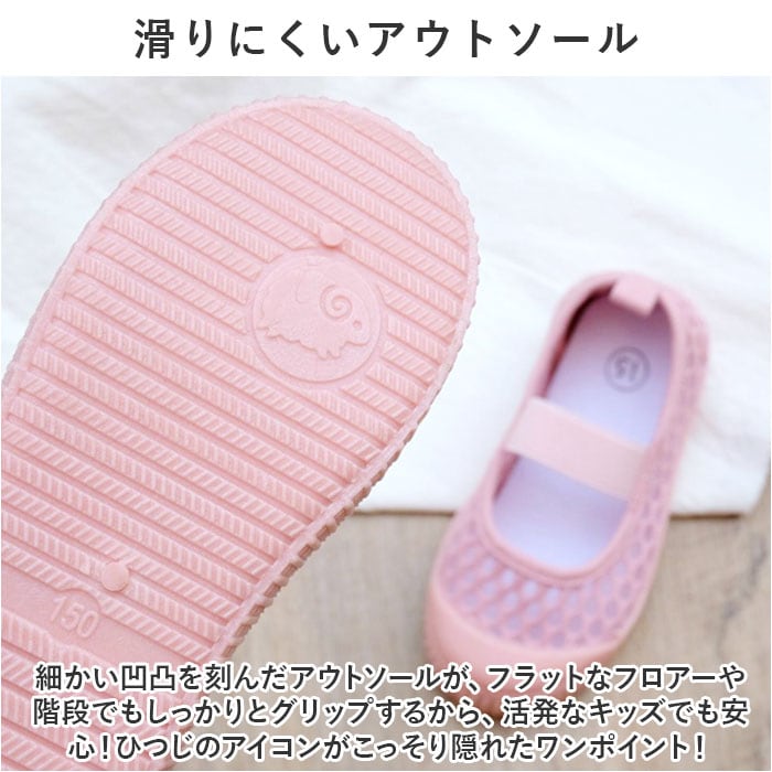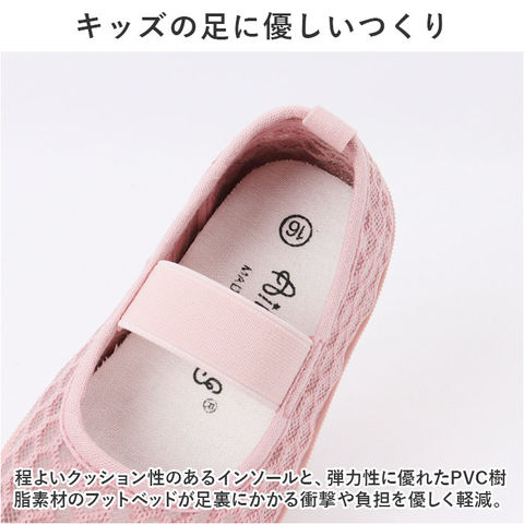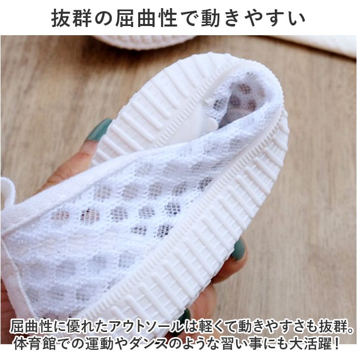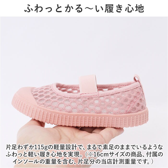 | 商品説明 | スクールスタイルの足元に、ほんのり自分色をプラス♪シースルーメッシュが大人可愛い「キッズ用スクールシューズ(上履き)」が新登場。【キッズの足に優しいつくり】程よいクッション性のあるインソールと、弾力性に優れたPVC樹脂素材のフットベッドが足裏にかかる衝撃や負担を優しく軽減。【ふわっとかる~い履き心地】片足わずか115gの軽量設計で、まるで素足のままでいるようなふわっと軽い履き心地を実現。(※16cmサイズの商品、付属のインソールの重量を含む、片足分の当店計測重量です。)【爽やか快適立体メッシュ仕様】アッパー生地は、通気性が高く熱がこもりにくい、ハニカム形状の立体メッシュ生地仕上げ。蒸し暑さが気になる季節でも足元は爽やか快適。【スポッと履けて、脱げにくい!】混雑する学校の昇降口でもスポッと履ける!ゴムベルトが足の甲にぴったりフィットして、脱げにくいのも嬉しいポイント。【滑りにくいアウトソール】細かい凹凸を刻んだアウトソールが、フラットなフロアーや階段でもしっかりとグリップするから、活発なキッズでも安心!ひつじのアイコンがこっそり隠れたワンポイント!【抜群の屈曲性で動きやすい】屈曲性に優れたアウトソールは軽くて動きやすさも抜群。体育館での運動やダンスのような習い事にも大活躍!【お手入れ簡単、いつでも清潔】インソールは取り外しができるので、手軽に水洗いができていつでも清潔さをキープ。【足元もさりげなくオシャレに】レースのような透け感と、合わせやすいシンプルカラーがさりげなくオシャレ。ホワイトと学年カラーのオーソドックスな上履きでは満足できないお洒落キッズにオススメ。 |