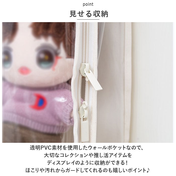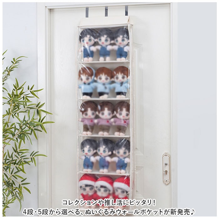 | 商品説明 | コレクションや推し活にピッタリ!4段・5段から選べる、ぬいぐるみウォールポケットが新発売♪【すっきり壁掛け収納】ごちゃつきがちなぬいぐるみを整理整頓して、すっきり壁掛け収納ができる!空間を活用し、お気に入りのアレコレをキレイに収納◎【見せる収納】透明PVC素材を使用したウォールポケットなので、大切なコレクションや推し活アイテムをディスプレイのように収納ができる!ほこりや汚れからガードしてくれるのも嬉しいポイント♪【通気性◎】布部分は通気性のよいコットン生地を採用。【フックつき】・2種類の専用フックつき。ドア用と壁用があるので、お部屋のいろんな場所に設置可能。工具要らずなので、ラクラク設置!【ダブルファスナー】開閉しやすいダブルファスナー仕様。広く開くので、物の出し入れがスムーズ。使いやすさにもこだわったアイテム。【ロック穴あり】ファスナーには南京錠などをつけられるロック穴あり◎大切なコレクションを施錠して保管できるのもGOOD。南京錠1つ付属。 |