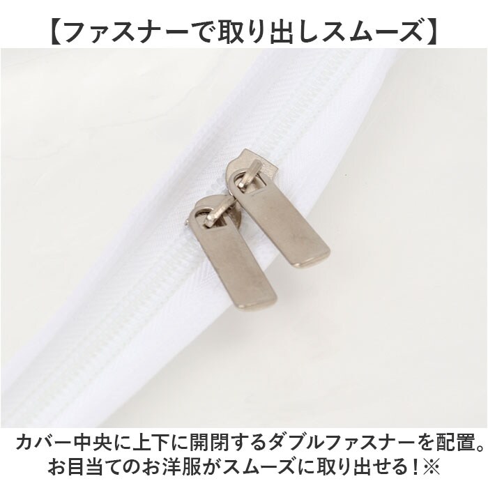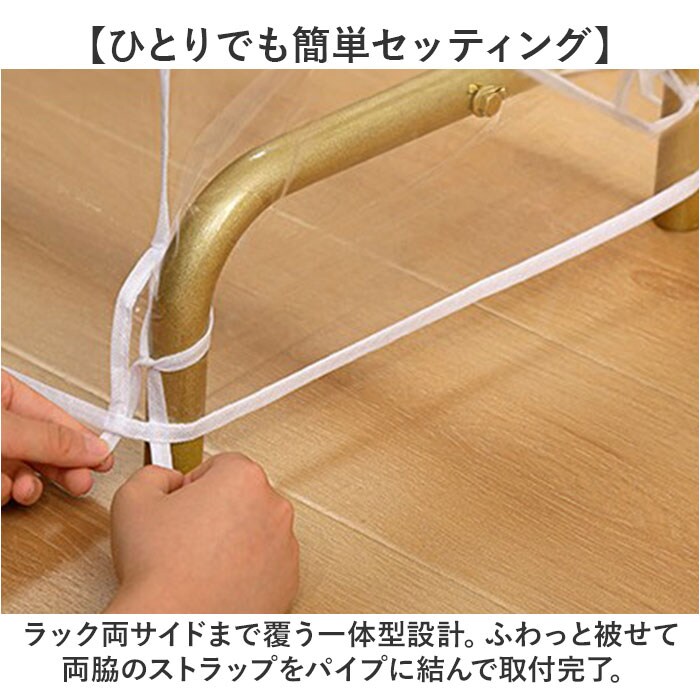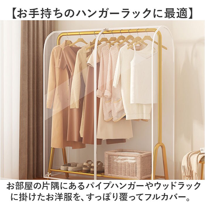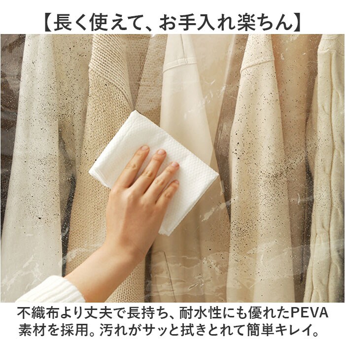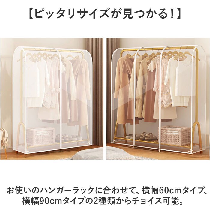 | 商品説明 | 【大切な衣類のホコリ除け、虫除けに】衣類ハンガーにサッと掛けるだけですぐに使える「ハンガーラックカバー(2サイズ)」が新登場。【お手持ちのハンガーラックに最適】お部屋の片隅にあるパイプハンガーやウッドラックに掛けたお洋服を、すっぽり覆ってフルカバー。【ホコリや汚れを寄せ付けない】オフシーズンに袖を通さないコートや上着も、ハンガーに掛けたままでホコリや汚れからガード。【長く使えて、お手入れ楽ちん】不織布より丈夫で長持ち、耐水性にも優れたPEVA素材を採用。汚れがサッと拭きとれて簡単キレイ。【ファスナーで取り出しスムーズ】カバー中央に上下に開閉するダブルファスナーを配置。お目当てのお洋服がスムーズに取り出せる!※横幅60cmタイプ(60×50×150cm)は中央に1列、横幅90cmタイプ(90×50×150cm)は、正面に2列のファスナーを配置しています。【ワードローブをひと目で確認】ラックに掛けた衣類が透けて見える透明or半透明カラー。お出掛け前のお洋服選びも迷わない♪【コートの裾まできちんとカバー】洋服の裾まですっぽり覆う長さ約150cmのゆったりサイズ。コートなど丈の長い服の保管にも最適。【ひとりでも簡単セッティング】ラック両サイドまで覆う一体型設計。ふわっと被せて両脇のストラップをパイプに結んで取付完了。【ピッタリサイズが見つかる!】お使いのハンガーラックに合わせて、横幅60cmタイプ、横幅90cmタイプの2種類からチョイス可能。 |