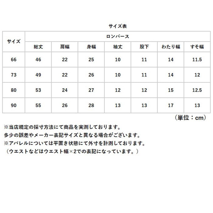 | サイズ | [ベビー] ・66cm ・73cm ・80cm ・90cm ※サイズについて詳細は、商品画像の中にあるサイズ表をご覧くださいませ。 |