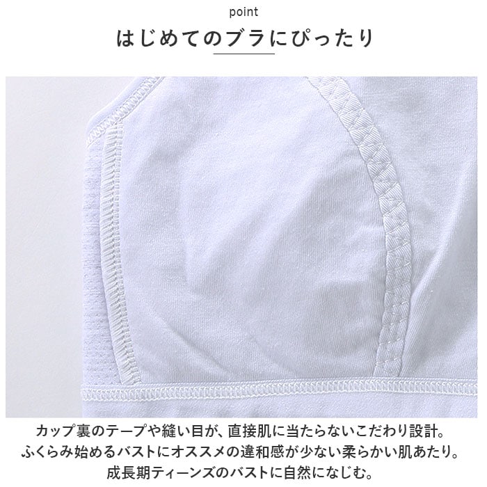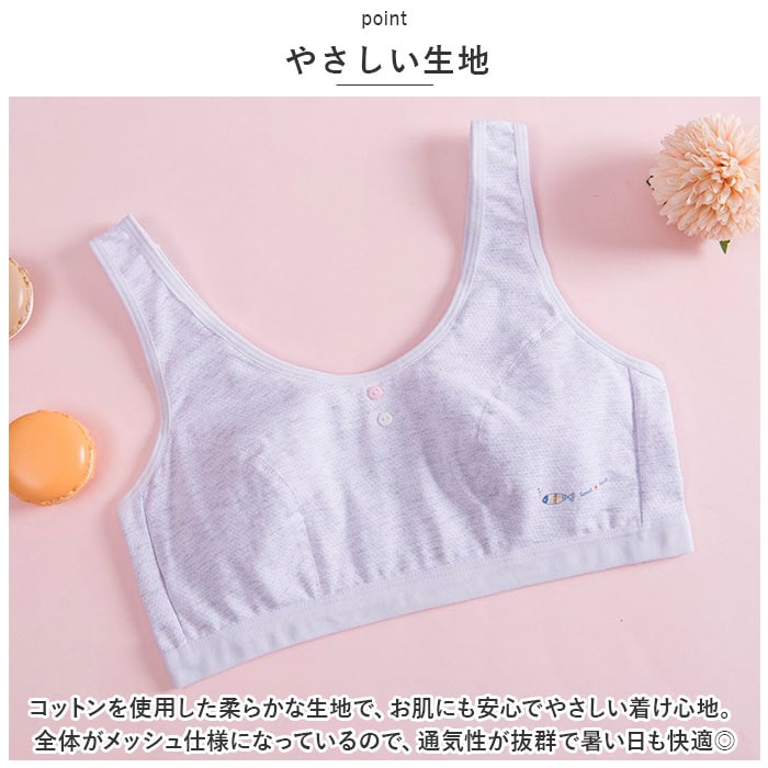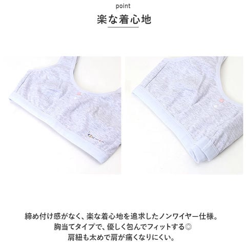 | 商品説明 | コットン使用でお肌に優しく気持ちよい肌触り。シンプルでさりげないデザインが可愛い♪「ジュニアブラ 3枚セット」が登場!【やさしい生地】コットンを使用した柔らかな生地で、お肌にも安心でやさしい着け心地。全体がメッシュ仕様になっているので、通気性が抜群で暑い日も快適◎【はじめてのブラにぴったり】カップ裏のテープや縫い目が、直接肌に当たらないこだわり設計。ふくらみ始めるバストにオススメの違和感が少ない柔らかい肌あたり。成長期ティーンズのバストに自然になじむ。【楽な着心地】締め付け感がなく、楽な着心地を追求したノンワイヤー仕様。胸当てタイプで、優しく包んでフィットする◎肩紐も太めで肩が痛くなりにくい。【着脱ラクラク】ホックがないスポーツブラタイプなので、着脱がラクラク。動きやすいので、運動時もストレスフリー。【シンプルで可愛いデザイン】シンプルなさりげないデザインが可愛い♪服に響きにくいので、洋服や体操服を着た時も自然。安心して着用できる。【嬉しい3枚セット】毎日使うものだから、洗い替え用に嬉しい3枚セット。ナチュラルな淡いカラーなのでお子様のお気に入りに◎ |