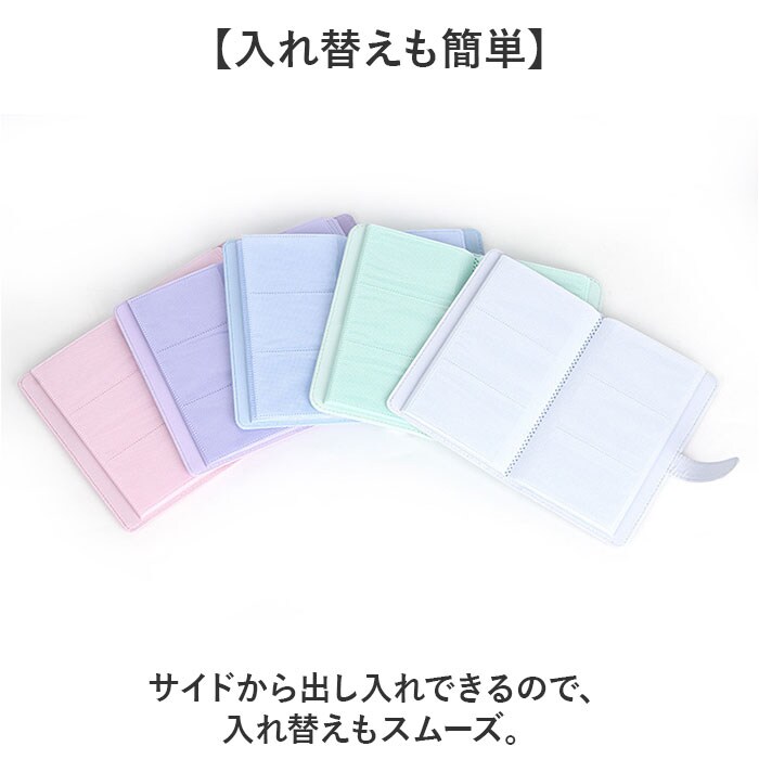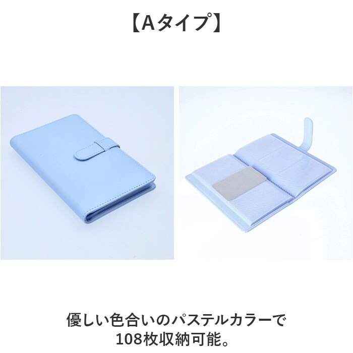 | 商品説明 | 【思い出を大切に保管】コンパクトサイズのチェキアルバムが登場。【たっぷり大容量】チェキ写真をたくさん入れられる抜群の収納力!写真以外にトレカを入れても◎【入れ替えも簡単】サイドから出し入れできるので、入れ替えもスムーズ。【持ち運びにも便利なサイズ感】差し込みベルト式なのでバッグに入れてもかさばらず、持ち歩きもラクラク!【スタイリッシュなデザイン】手帳型のシンプルなデザイン。お気に入りがきっと見つかる!【Aタイプ】優しい色合いのパステルカラーで108枚収納可能。【Bタイプ】コルクのようなナチュラルな風合いで96枚収納可能。 |