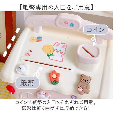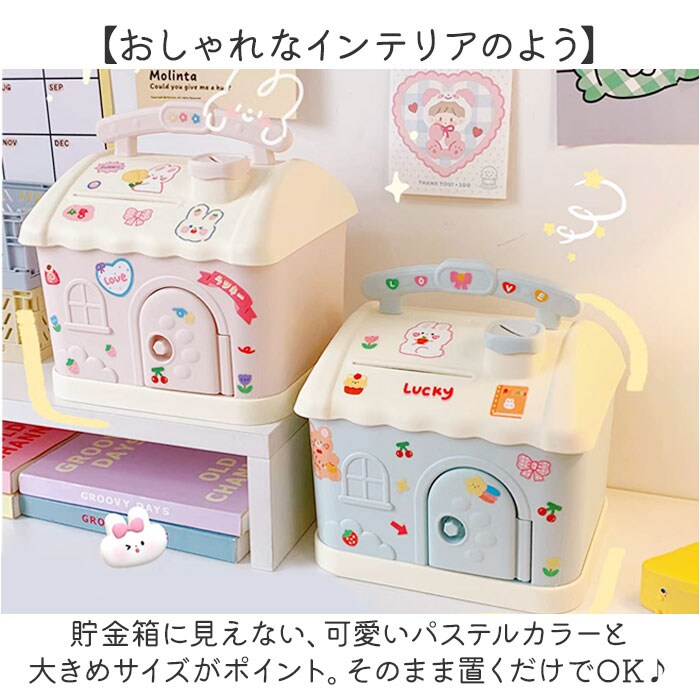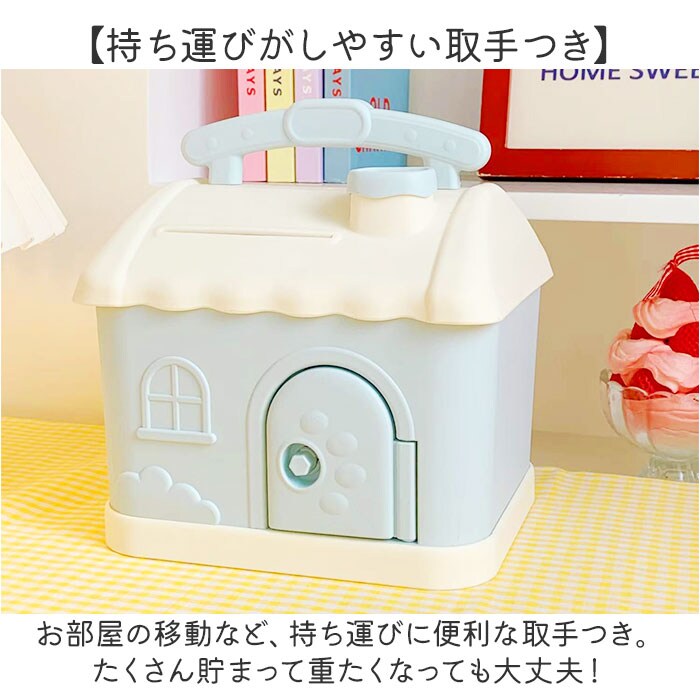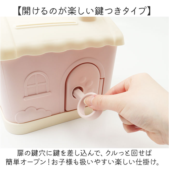 | 商品説明 | 【小さなお家の貯金箱☆】お子様から大人まで、みんなで楽しく貯金♪「可愛い家型 貯金箱」が登場。【おしゃれなインテリアのよう】貯金箱に見えない、可愛いパステルカラーと大きめサイズがポイント。そのまま置くだけでOK♪【開けるのが楽しい鍵つきタイプ】扉の鍵穴に鍵を差し込んで、クルっと回せば簡単オープン!お子様も扱いやすい楽しい仕掛け。【紙幣専用の入口をご用意】コインと紙幣の入口をそれぞれご用意。紙幣は折り曲げずに収納できる!【たくさん貯まるBIGサイズ】毎日ひとりでコツコツと、家族や友達と一緒に貯金♪など、いろんな使い方が楽しめる!【知育用のおもちゃにもオススメ】鍵を開けて、コインを入れて…指先をたくさん使うから、お子様の知育玩具としても◎【持ち運びがしやすい取手つき】お部屋の移動など、持ち運びに便利な取手つき。たくさん貯まって重たくなっても大丈夫! |