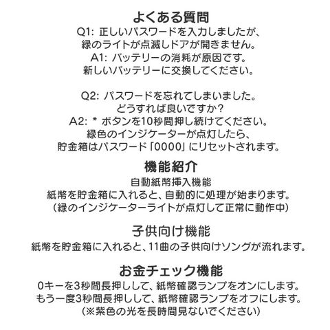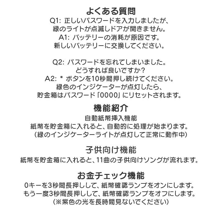 | 商品説明 | 【たくさんのギミックが面白い☆】お子様から大人まで、みんなで楽しく貯金♪「電子貯金箱 金庫型」が登場。【まるで銀行みたいな貯金箱】貯金箱に見えない、可愛いデザインが魅力。オートマチック、暗証番号など銀行みたいな仕組み【パスワード設定でしっかり管理】自分だけのパスワードを設定できるので、安心して保管できる。※初期パスワードは「0000」変更方法は説明書(英文表記)をご確認ください。【自動販売機みたいにお金をIN】コインもお札も入る作り。自動でお札を吸い込んでくれるから、本物のATMみたい!【音楽が流れるギミックを搭載】お札を吸い込む際に、楽しい音楽が流れる♪ランダム再生なので、飽きずにずっと楽しめる。【貯金のモチベーションをUP】ロック解除のギミック音も楽しいので、貯金箱を開けるときもワクワク♪【たっぷり入るサイズ感】保管スペースは、お札を入れても安心の大きめサイズ。大切な手紙などを保管するのも◎【お好みのデザインをチョイス!】可愛いアニマル達のデザインをご用意。ちょっとしたギフトにもオススメのアイテム。※乾電池は別売りです。単三電池を3本使用。 |