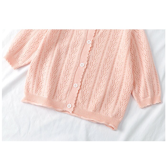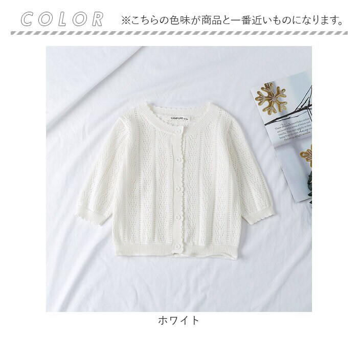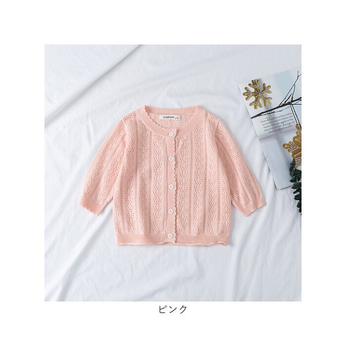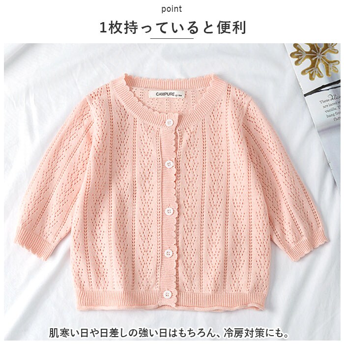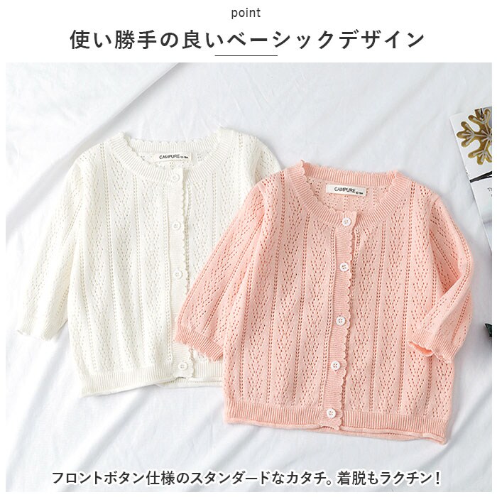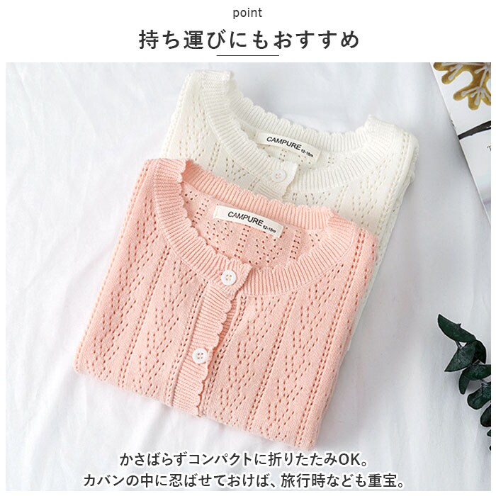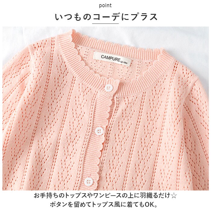 | 商品説明 | 女の子らしい繊細なデザインが魅力♪ベビー用のカーディガンが新登場。【使い勝手の良いベーシックデザイン】フロントボタン仕様のスタンダードなカタチ。着脱もラクチン!【いつものコーデにプラス】お手持ちのトップスやワンピースの上に羽織るだけ☆ボタンを留めてトップス風に着てもOK。【チクチク感がなく快適】柔らかくお肌に優しいコットン素材を使用。デリケートなベビーにも安心◎【1枚持っていると便利】肌寒い日や日差しの強い日はもちろん、冷房対策にも。【持ち運びにもおすすめ】かさばらずコンパクトに折りたたみOK。カバンの中に忍ばせておけば、旅行時なども重宝。 |