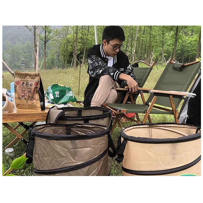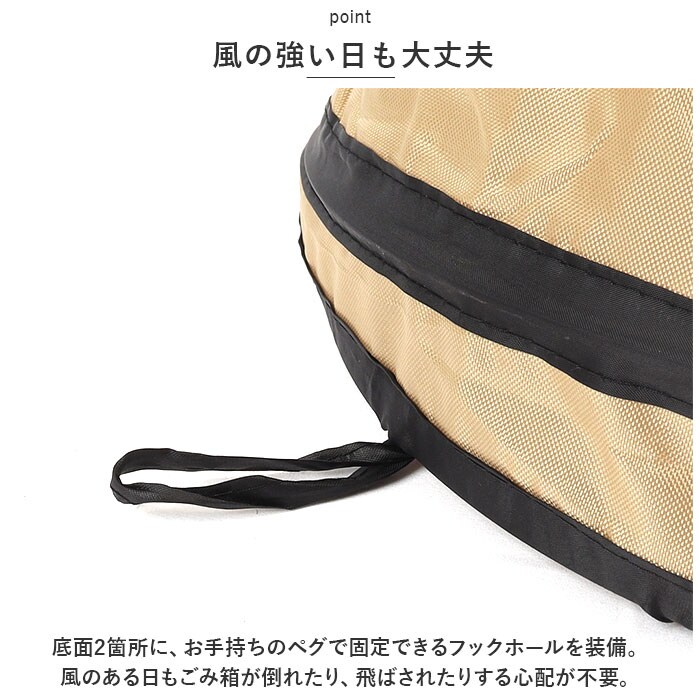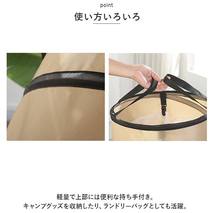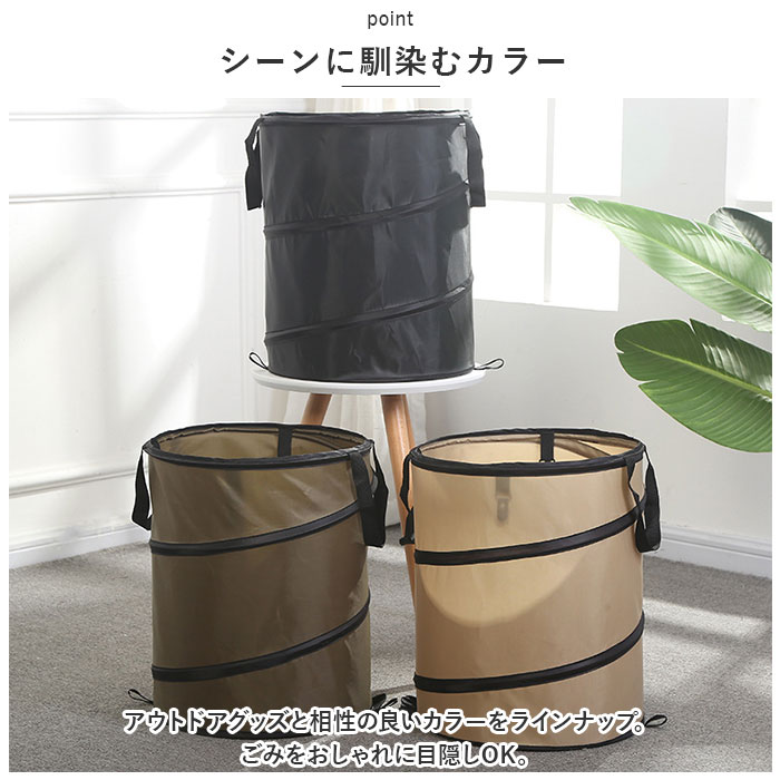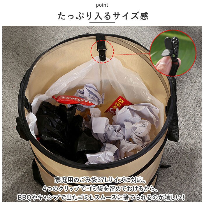 | 商品説明 | アウトドアシーンで大活躍!ポップアップ式のごみ箱が新登場。【サッと展開&収納できるポップアップタイプ】・2箇所のボタンを外すだけで、自動的にポップアップ!使わない時は下部まで押して、ボタンを閉じればスリムサイズに。【たっぷり入るサイズ感】家庭用のごみ袋37Lサイズに対応。4つのクリップでゴミ袋を留めておけるから、BBQやキャンプで出たゴミもスムーズに捨てられるのが嬉しい!【シーンに馴染むカラー】アウトドアグッズと相性の良いカラーをラインナップ。ごみをおしゃれに目隠しOK。【風の強い日も大丈夫】底面2箇所に、お手持ちのペグで固定できるフックホールを装備。風のある日もごみ箱が倒れたり、飛ばされたりする心配が不要。【使い方いろいろ】軽量で上部には便利な持ち手付き。キャンプグッズを収納したり、ランドリーバッグとしても活躍。 |