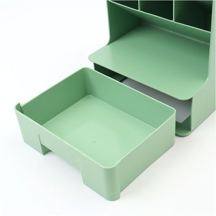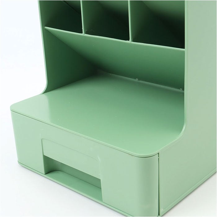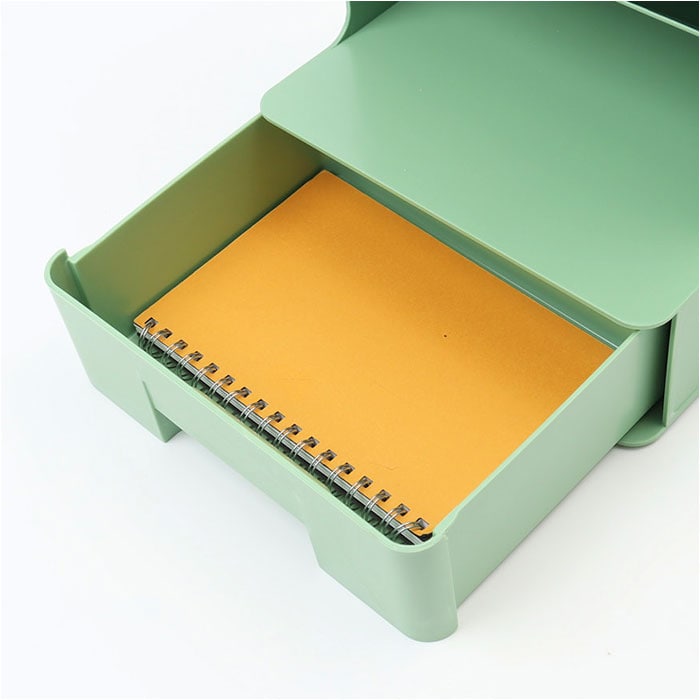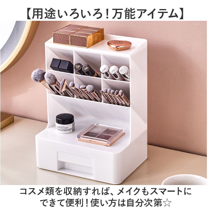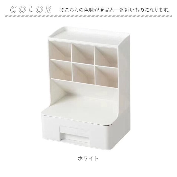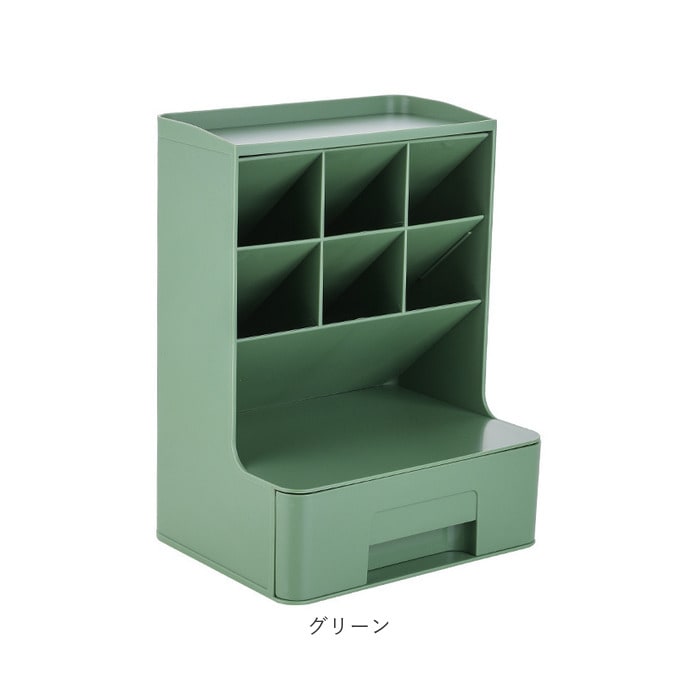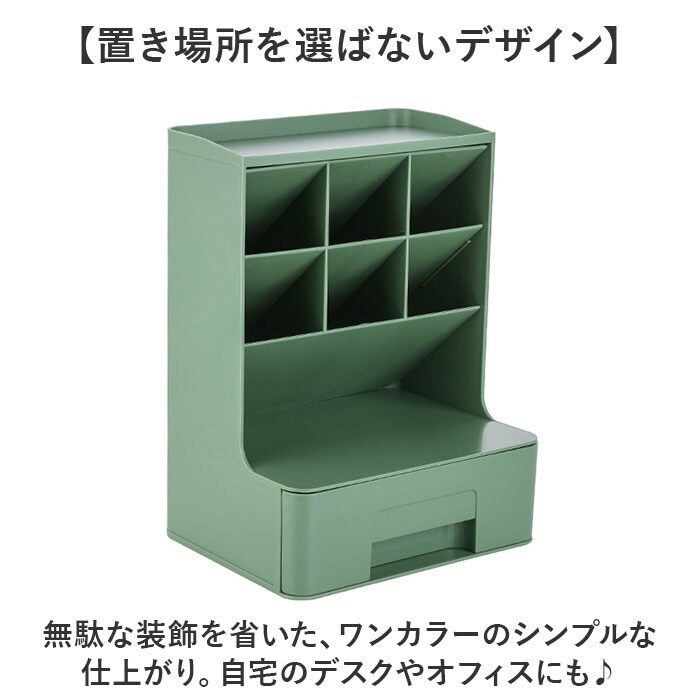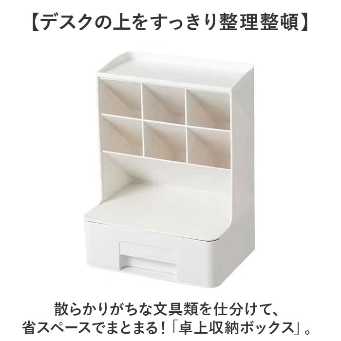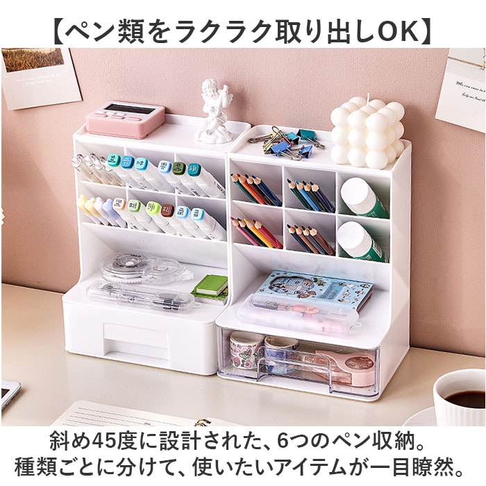 | 商品説明 | 【デスクの上をすっきり整理整頓】散らかりがちな文具類を仕分けて、省スペースでまとまる!「卓上収納ボックス」。【置き場所を選ばないデザイン】無駄な装飾を省いた、ワンカラーのシンプルな仕上がり。自宅のデスクやオフィスにも♪【ペン類をラクラク取り出しOK】斜め45度に設計された、6つのペン収納。種類ごとに分けて、使いたいアイテムが一目瞭然。【テープや付箋などは引き出しに】・1段式の引き出しには、マスキングテープのコレクションや、付箋をIN。【上部や引き出し上も有効活用】上部には時計やクリームなど。引き出し上には、作業中に使用頻度の高い小物を。【用途いろいろ!万能アイテム】コスメ類を収納すれば、メイクもスマートにできて便利!使い方は自分次第☆ |