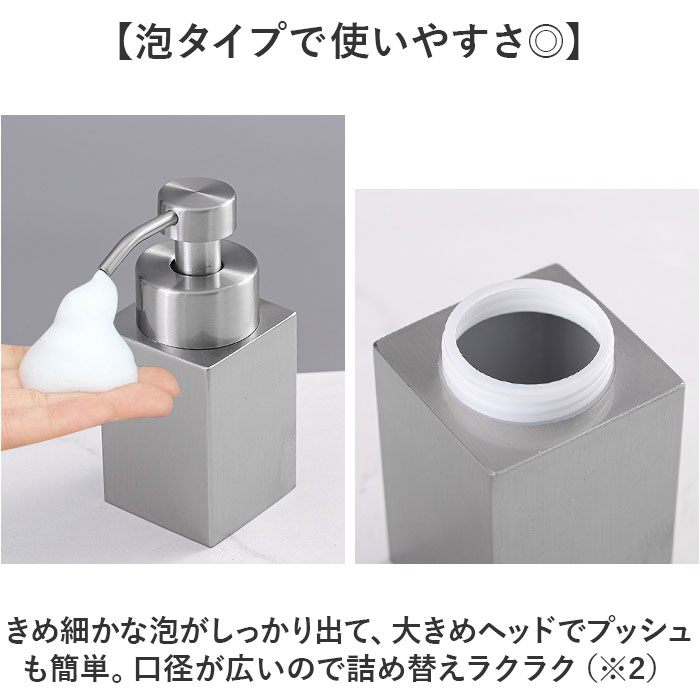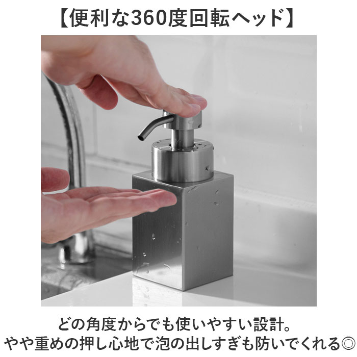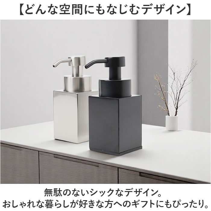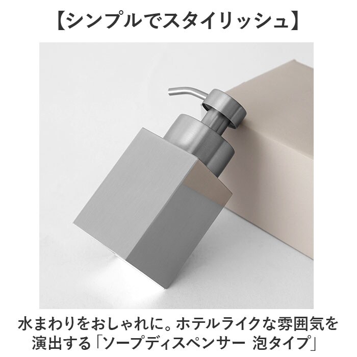 | 商品説明 | 【シンプルでスタイリッシュ】水まわりをおしゃれに。ホテルライクな雰囲気を演出する「ソープディスペンサー 泡タイプ」【毎日使いにぴったりのステンレス製】丈夫でサビにくいステンレス素材を使用。底面には滑り止めや保護クッション付きで安心♪(※1)シルバーは保護クッション付き、ブラックは滑り止め付きです。【泡タイプで使いやすさ◎】きめ細かな泡がしっかり出て、大きめヘッドでプッシュも簡単。口径が広いので詰め替えラクラク(※2容量:約200ml)【便利な360度回転ヘッド】どの角度からでも使いやすい設計。やや重めの押し心地で泡の出しすぎも防いでくれる◎【どんな空間にもなじむデザイン】無駄のないシックなデザイン。おしゃれな暮らしが好きな方へのギフトにもぴったり。 |