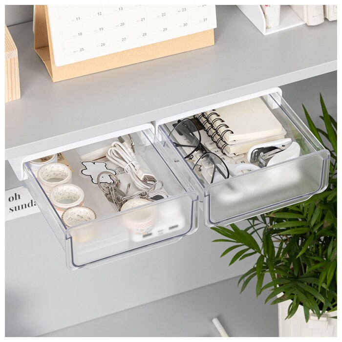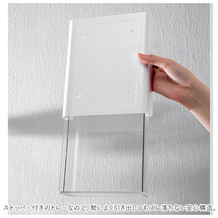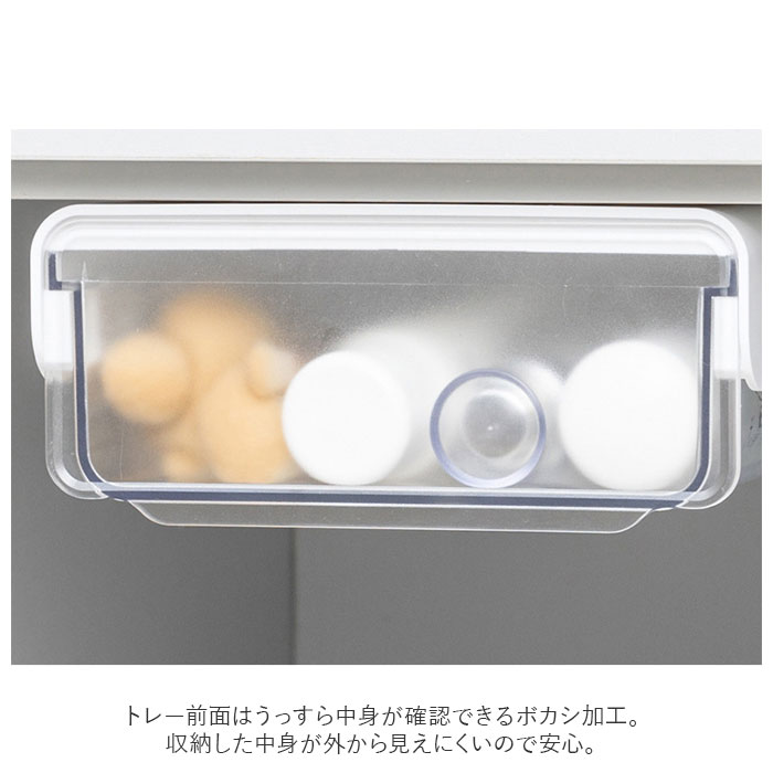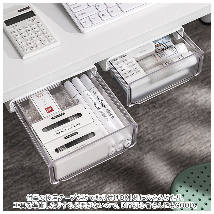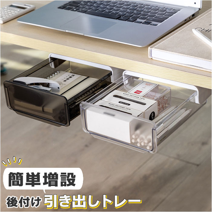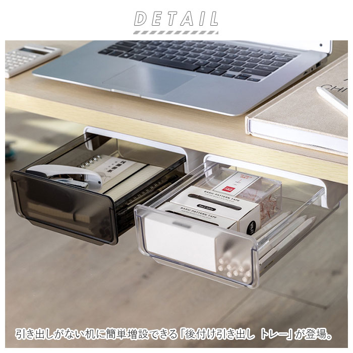 | 商品説明 | 引き出しがない机に簡単増設できる「後付け引き出し トレー」が登場。付属の接着テープだけで取り付けOK!机に穴をあけたり、工具を準備したりする必要がないので、DIY初心者さんにもGOOD。トレーをスムーズに引き出せる小さなつまみ付き。指先をひっかけて手前に引くだけ。ストッパー付きのトレーなので、勢いよく引き出してもズレ落ちない安心構造。トレー前面はうっすら中身が確認できるボカシ加工。収納した中身が外から見えにくいので安心。机はもちろん、キッチンテーブルや本棚など色々なデッドスペースを活用できる♪ |