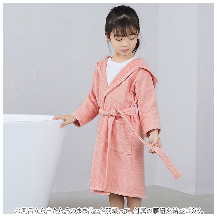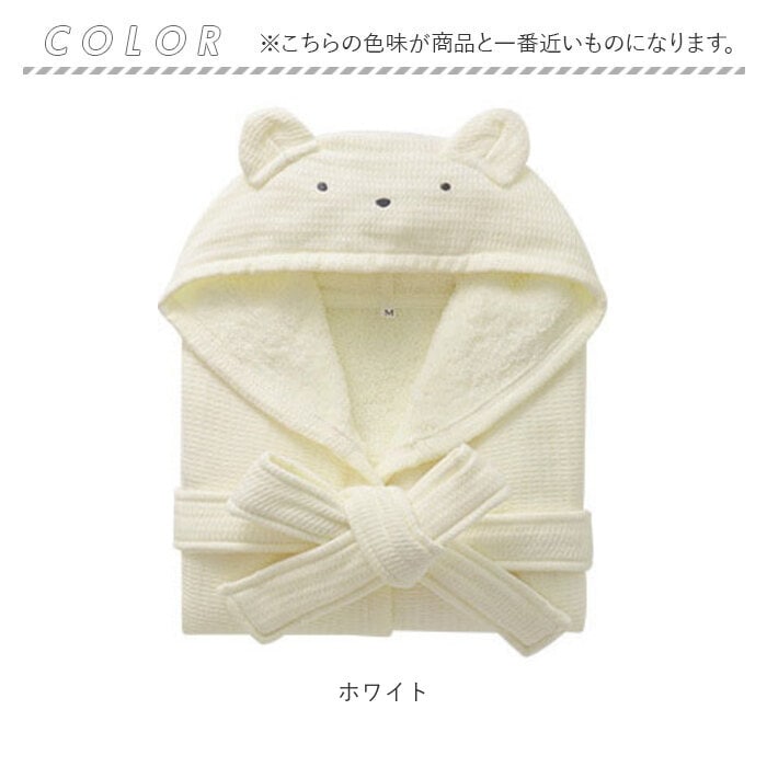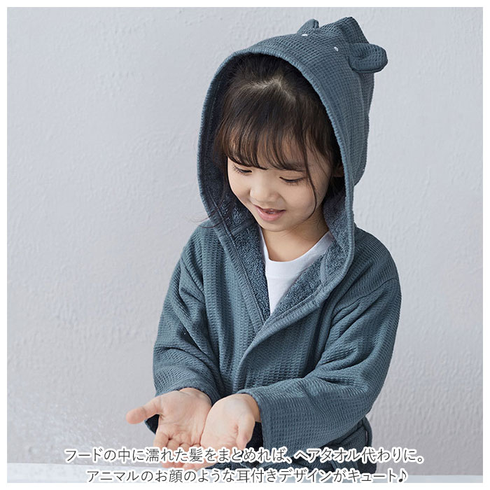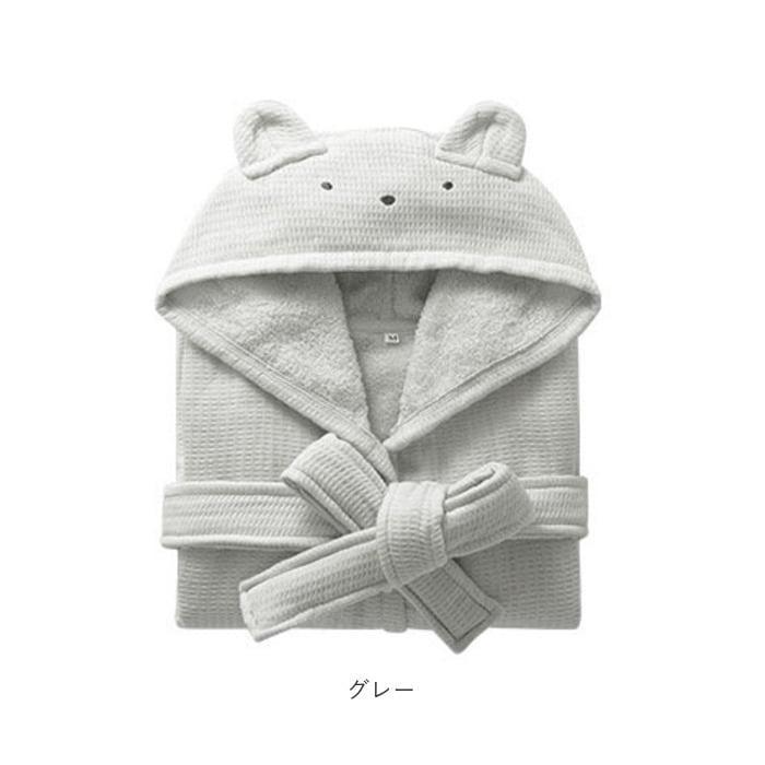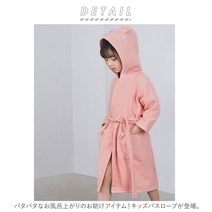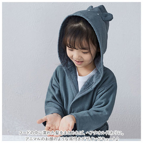 | 商品説明 | バタバタなお風呂上がりのお助けアイテム!キッズバスローブが登場。デリケートなお子さまの肌に優しい、コットン素材を使用したバスローブ。お風呂から出たらそのままサッと羽織って、付属の腰紐を結べばOK。裏面は柔らかなタオル地になっており、全身の水分をすばやく吸水!湯冷めの心配も不要◎フードの中に濡れた髪をまとめれば、ヘアタオル代わりに。アニマルのお顔のような耳付きデザインがキュート♪左右に便利なポケットを配置。成長に合わせて選べる3サイズ展開。兄弟・姉妹お揃いで使えるのが嬉しい! |