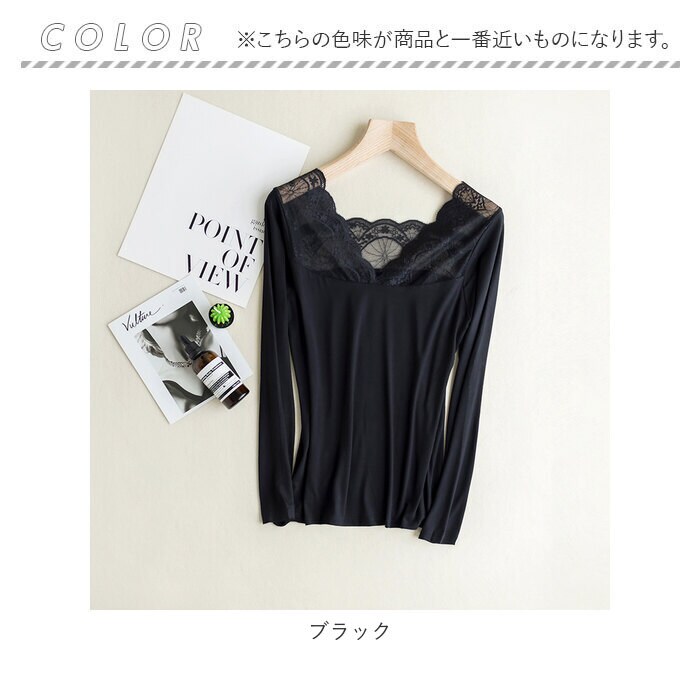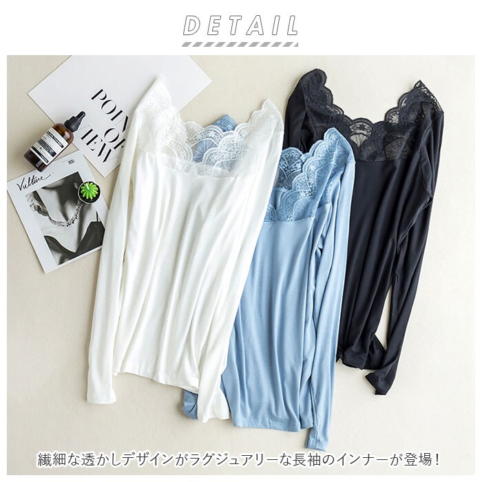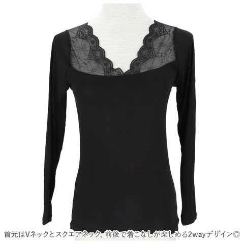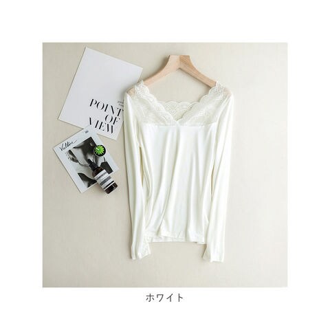 | 商品説明 | 繊細な透かしデザインがラグジュアリーな長袖のインナーが登場!襟元に花柄のレースデザインを施し、シンプルながらも上品な雰囲気。首元はVネックとスクエアネック、前後で着こなしが楽しめる2wayデザイン◎伸縮性のある素材なので、身体に心地よくフィット。ゆったりとしたトップスやアウターとの組み合わせでメリハリのある着こなしができるのもポイント。 |