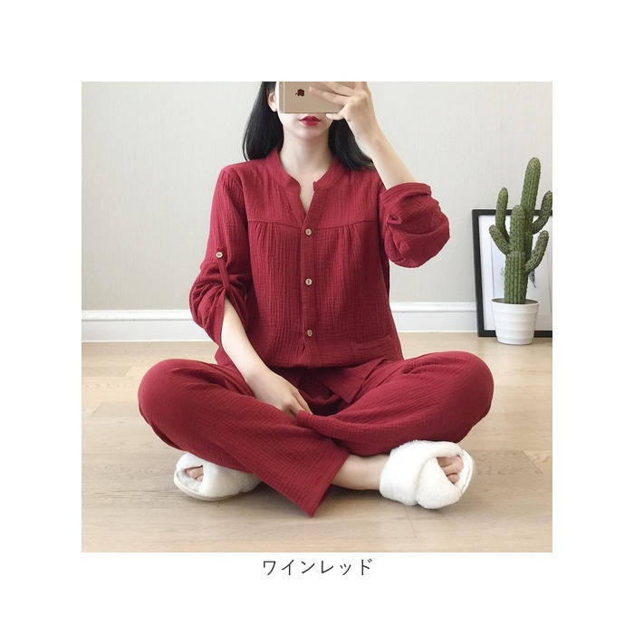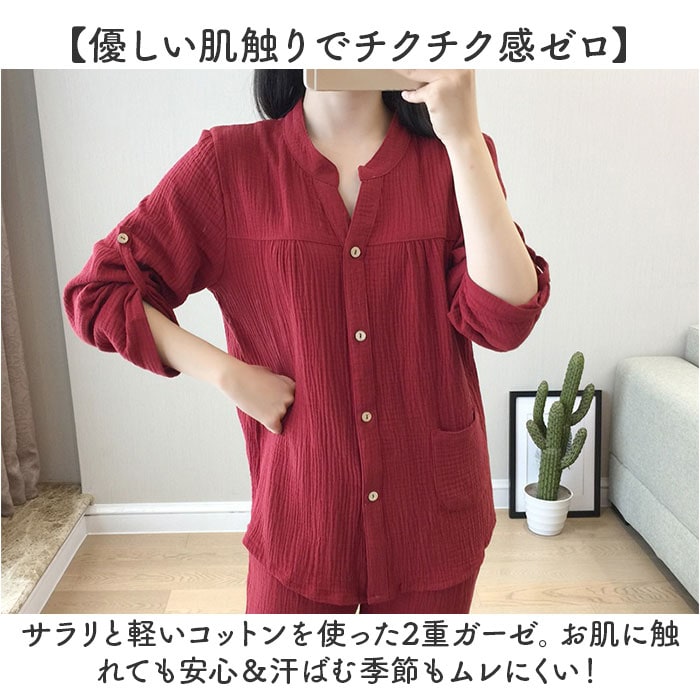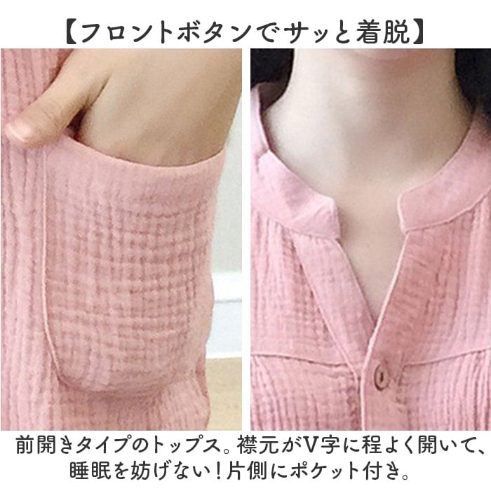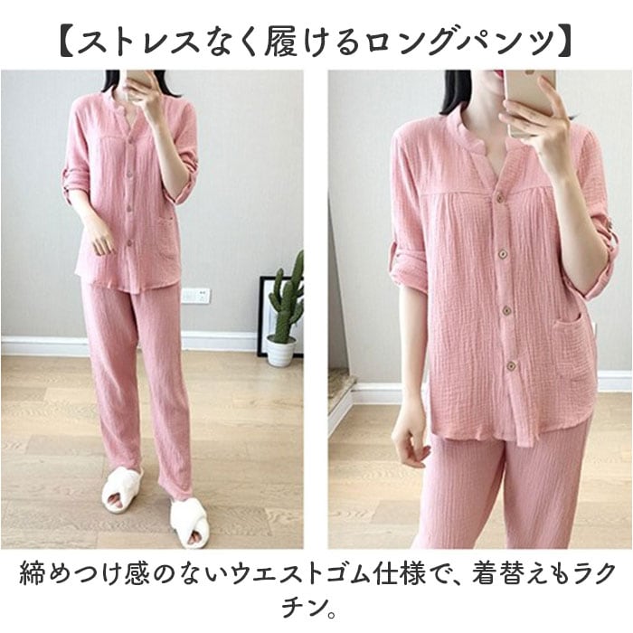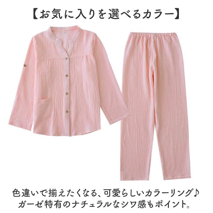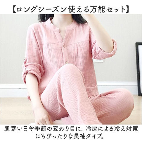 | 商品説明 | 【おうちの中でも可愛く快適に】お気に入りのアイテムで、心地よくリラックス♪「ガーゼルームウェア」が新登場。【ロングシーズン使える万能セット】肌寒い日や季節の変わり目に。冷房による冷え対策にもぴったりな長袖タイプ。【優しい肌触りでチクチク感ゼロ】サラリと軽いコットンを使った2重ガーゼ。お肌に触れても安心&汗ばむ季節もムレにくい!【フロントボタンでサッと着脱】前開きタイプのトップス。襟元がV字に程よく開いて、睡眠を妨げない!片側にポケット付き。【お好みで袖口をアレンジOK】汗ばむ時や洗顔など腕をまくりたいシーンでは、袖口のボタンを使ってロールアップ☆【ストレスなく履けるロングパンツ】締めつけ感のないウエストゴム仕様で、着替えもラクチン。【お気に入りを選べるカラー】色違いで揃えたくなる、可愛らしいカラーリング♪ガーゼ特有のナチュラルなシワ感もポイント。 |