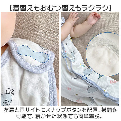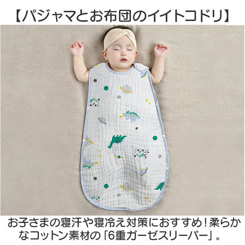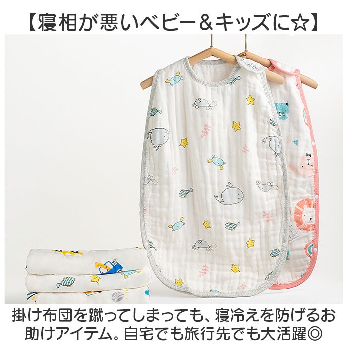 | 商品説明 | 【パジャマとお布団のイイトコドリ】お子さまの寝汗や寝冷え対策におすすめ!柔らかなコットン素材の「6重ガーゼスリーパー」。【寝相が悪いベビー&キッズに☆】掛け布団を蹴ってしまっても、寝冷えを防げるお助けアイテム。自宅でも旅行先でも大活躍◎【お肌に優しい6重ガーゼ仕様】・6層に重ねた、ふんわり軽やかな綿100%素材。デリケートな肌にも安心な心地よい肌触り☆【オールシーズン快適な着心地】ふんわりと空気を含み、寒い時は保湿性を発揮してあったか。暑い時は汗を吸収してサラサラ。【着替えもおむつ替えもラクラク】左肩と両サイドにスナップボタンを配置。横開き可能で、寝かせた状態でも簡単着脱。【めくれ上がりを防ぐ股下ボタン】股下のボタンを留めることで、足をバタつかせたり元気に動き回ってもはだけない♪【動きを妨げない袖なしタイプ】余裕をもたせた袖まわり。のびのびと腕を伸ばせて、ベビーたちも満面の笑顔でご機嫌☆【洗うほどに肌馴染みアップ】お洗濯するたびにガーゼがふわふわ!洗濯後の乾きが早いのも、嬉しいポイント。【ナチュラルで可愛らしいデザイン】男の子も女の子も着用できて、揃えたくなるプリント柄。成長に合わせて選べる4サイズ! |