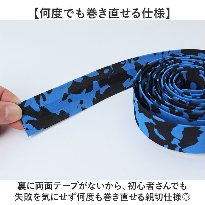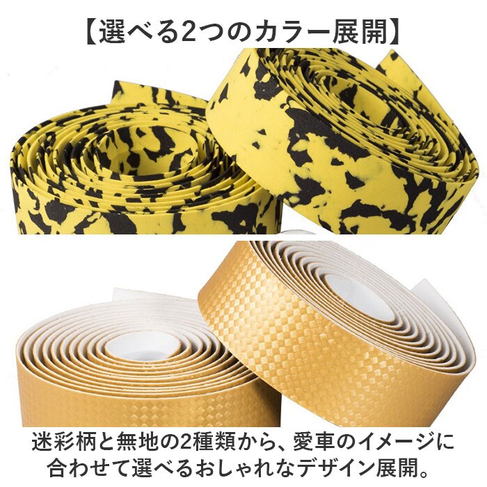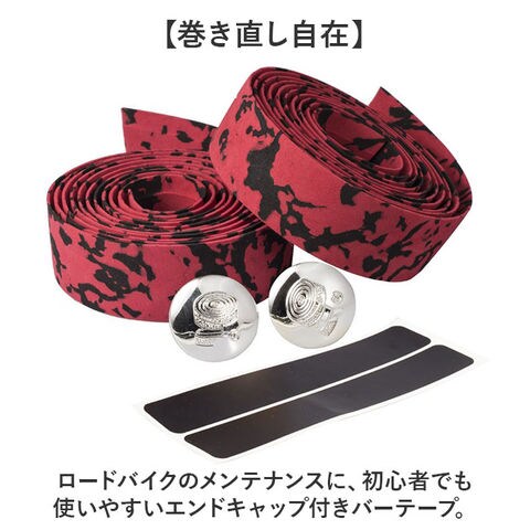 | 商品説明 | 【巻き直し自在】ロードバイクのメンテナンスに、初心者でも使いやすいエンドキャップ付きバーテープ。【何度でも巻き直せる仕様】裏に両面テープがないから、初心者さんでも失敗を気にせず何度も巻き直せる親切仕様◎【たっぷり使える長さ】全長約200cm、幅約3cmのサイズで、ドロップハンドルにもしっかり巻ける十分な長さ〇【握りやすい】ほどよい弾力で衝撃を吸収し、滑りにくく握りやすい素材を使用!【簡単装着】巻き終わりはハサミで斜めに切って、ビニールテープで止めるだけ。エンドキャップが付いているのでハンドルバーに固定できる。【選べる2つのカラー展開】迷彩柄と無地の2種類から、愛車のイメージに合わせて選べるおしゃれなデザイン展開。 |