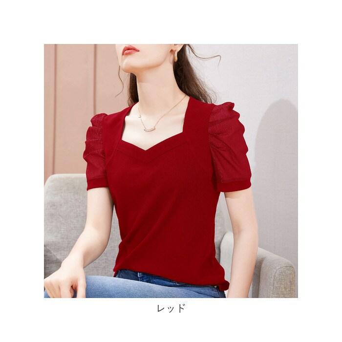 バルーン袖カットソー 半袖 ykj213【レッド】【XXL】