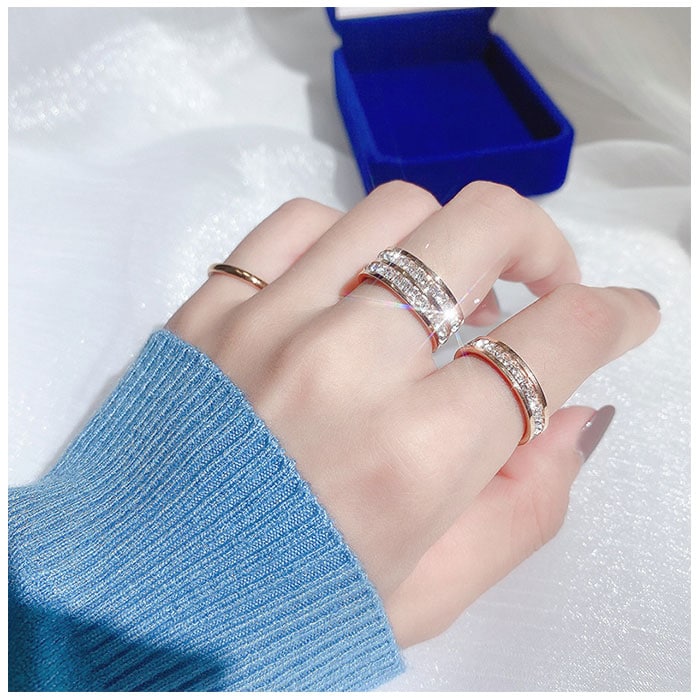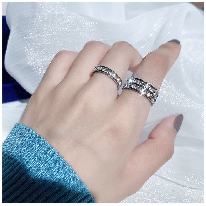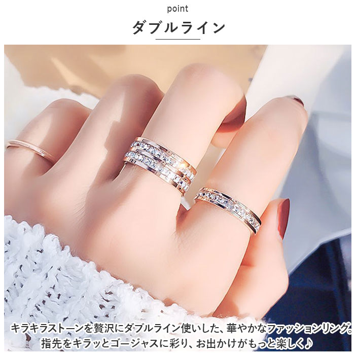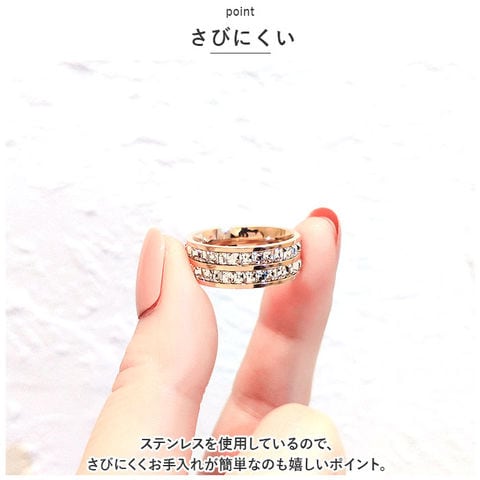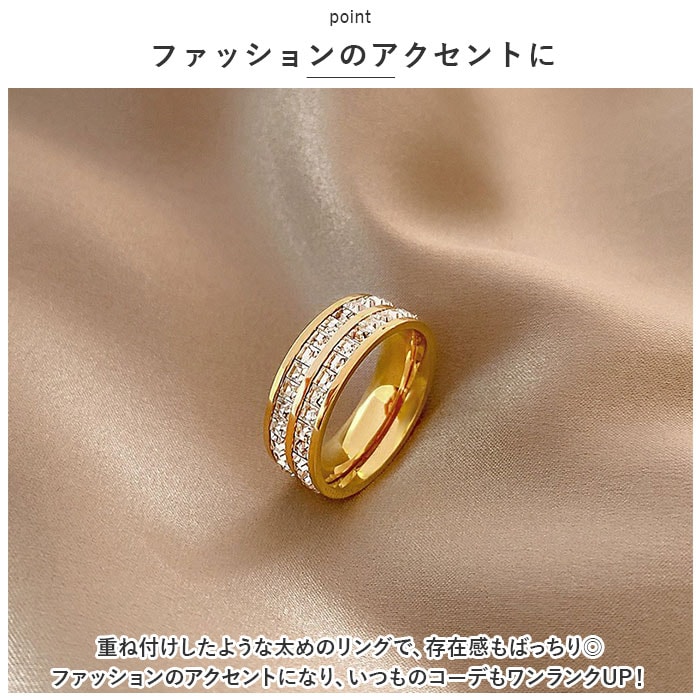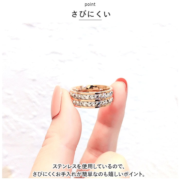 | 商品説明 | さびにくい◎ダブルラインのキラキラリング♪「指輪」が登場。【ダブルライン】キラキラストーンを贅沢にダブルライン使いした、華やかなファッションリング。指先をキラッとゴージャスに彩り、お出かけがもっと楽しく♪【ファッションのアクセントに】重ね付けしたような太めのリングで、存在感もばっちり◎ファッションのアクセントになり、いつものコーデもワンランクUP!【エタニティリングモチーフ】リングの全周にダイヤモンドが入ったエタニティリングのようなデザイン。上品さとカジュアルさを両立。【さびにくい】ステンレスを使用しているので、さびにくくお手入れが簡単なのも嬉しいポイント。【サイズが豊富】サイズを豊富にご用意。中指に付けてカジュアルに、薬指に付けてエレガントに♪お好みでチョイス! |