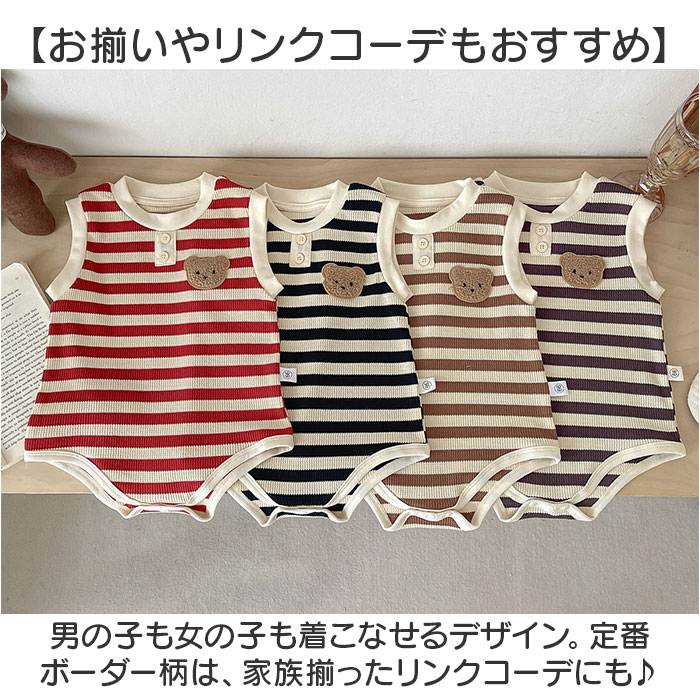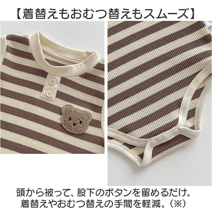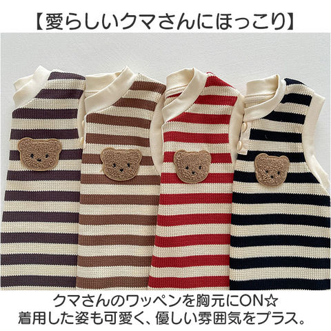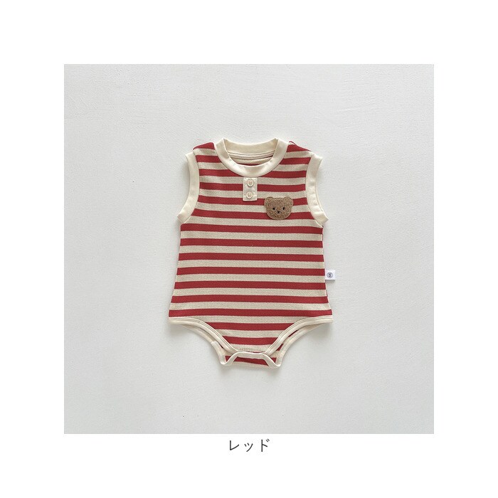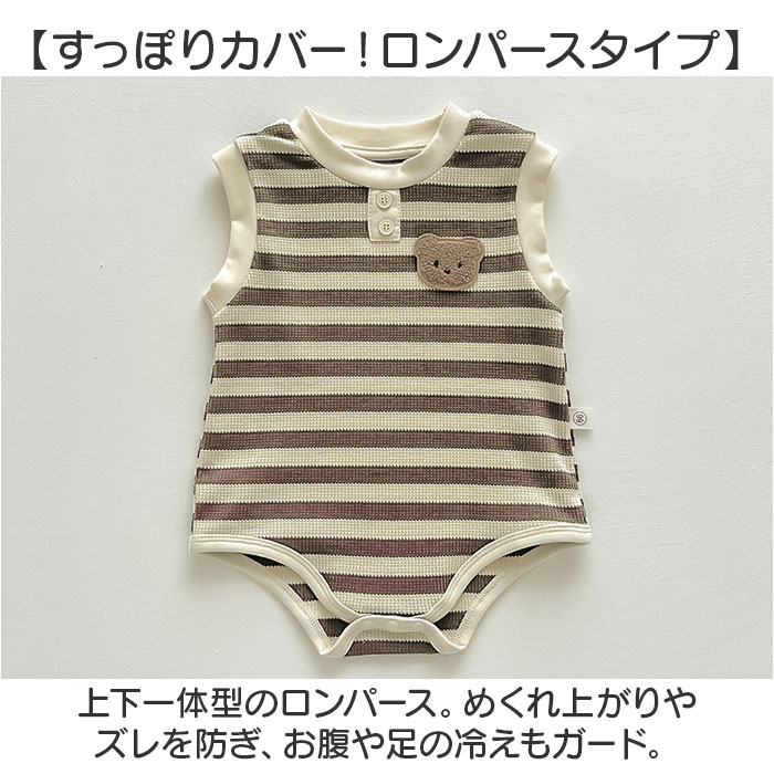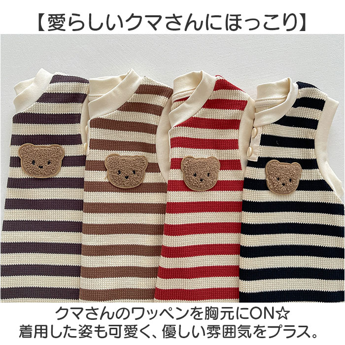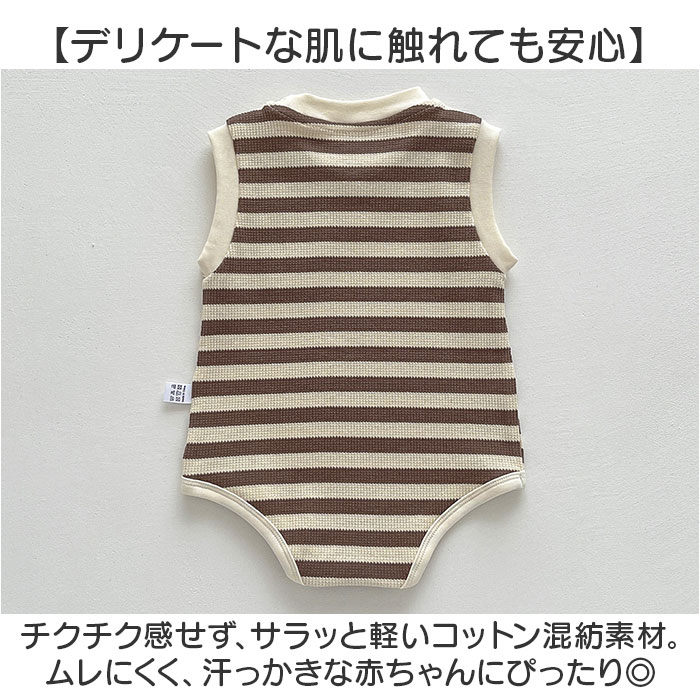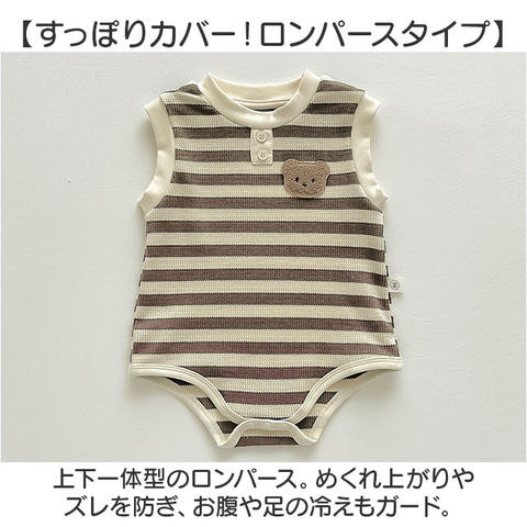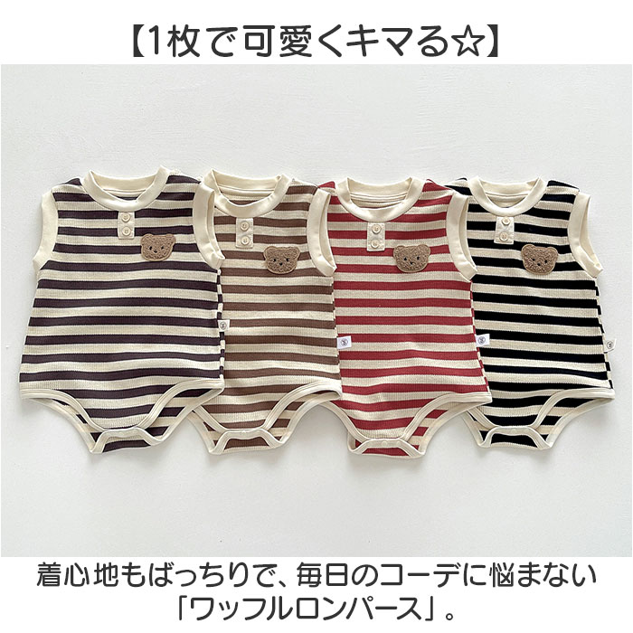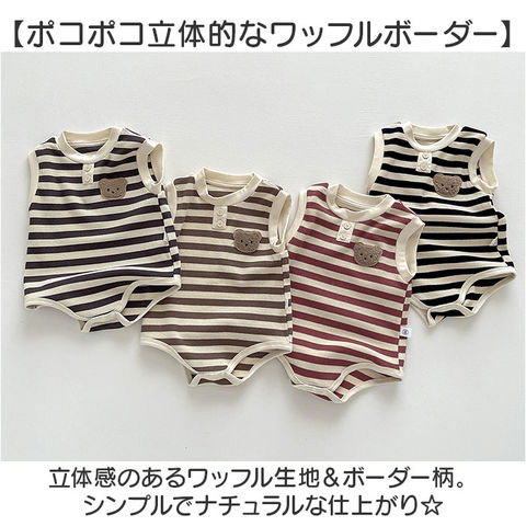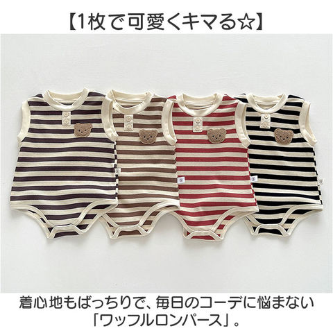 | 商品説明 | 【デイリーに活躍する味方】・1枚で可愛くキマる☆着心地もばっちりで、毎日のコーデに悩まない「ワッフルロンパース」。【すっぽりカバー!ロンパースタイプ】上下一体型のロンパース。めくれ上がりやズレを防ぎ、お腹や足の冷えもガード。【着替えもおむつ替えもスムーズ】頭から被って、股下のボタンを留めるだけ。着替えやおむつ替えの手間を軽減。(※)襟元ボタンはデザインです。【ポコポコ立体的なワッフルボーダー】立体感のあるワッフル生地&ボーダー柄。シンプルでナチュラルな仕上がり☆【デリケートな肌に触れても安心】チクチク感せず、サラッと軽いコットン混紡素材。ムレにくく、汗っかきな赤ちゃんにぴったり◎【ストレッチ素材で優しくフィット】ぐ~んと伸びて締め付け感ゼロ。袖や裾もゆったり、動きを妨げないノースリーブロンパース。【愛らしいクマさんにほっこり】クマさんのワッペンを胸元にON☆着用した姿も可愛く、優しい雰囲気をプラス。【お揃いやリンクコーデもおすすめ】男の子も女の子も着こなせるデザイン。定番ボーダー柄は、家族揃ったリンクコーデにも♪ |