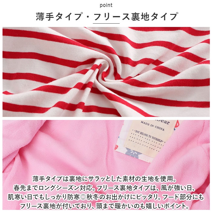 | 商品説明 | 普段のお出かけやアウトドアにピッタリ♪女の子向けウィンドブレーカーが新発売♪【薄手タイプ・フリース裏地タイプ】薄手タイプは裏地にサラッとした素材の生地を使用。春先までロングシーズン対応。フリース裏地タイプは、風が強い日、肌寒い日でもしっかり防寒◎秋冬のお出かけにピッタリ。フード部分にもフリース裏地が付いており、頭まで暖かいのも嬉しいポイント。【はっ水機能】雨粒や弾いたり、汚れに強いはっ水機能。雨の日のお出かけもサポート。【ファスナー仕様】フロントはファスナー仕様だからお子さま1人でもサッと着られる。【動きがスムーズ】袖口とウエスト部分にギャザーゴム入り。手首やウエストにしっかりフィットして動きを妨げず、程よい防寒性もUP!【便利なポケット】ハンカチなどの小物を入れておけるポケットを、左右に配置。【様々なシーンで】普段のアウターとしてはもちろん、キャンプなどのアウトドアシーンでも活躍★ |