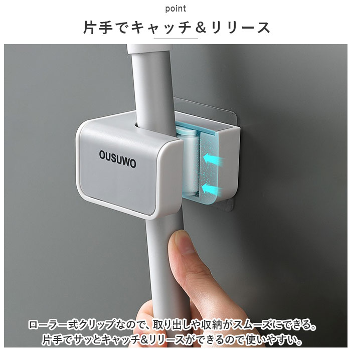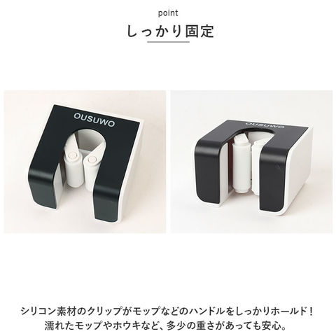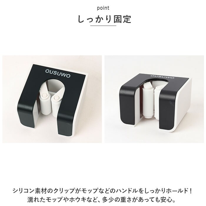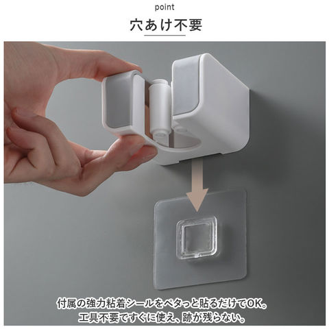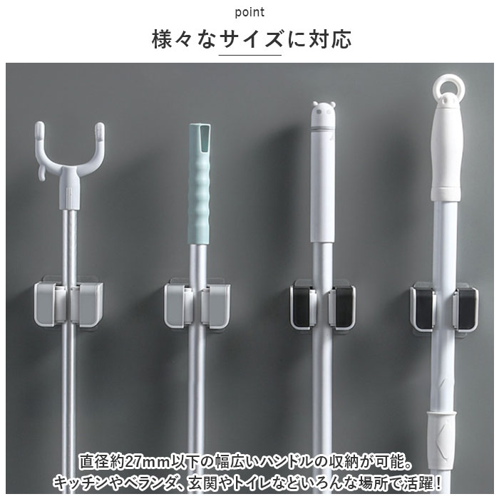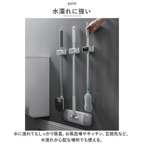 | 商品説明 | 壁の穴あけ不要!モップやホウキを浮かせる収納してスッキリ整理整頓。「モップホルダー3個セット」が登場【穴あけ不要】穴あけ不要◎付属の強力粘着シールをペタっと貼るだけでOK。工具不要ですぐに使え、跡が残らない。【しっかり固定】シリコン素材のクリップがモップなどのハンドルをしっかりホールド!濡れたモップやホウキなど、多少の重さがあっても安心。【片手でキャッチ&リリース】ローラー式クリップなので、取り出しや収納がスムーズにできる。片手でサッとキャッチ&リリースができるので使いやすい。【様々なサイズに対応】直径約27mm以下の幅広いハンドルの収納が可能。キッチンやベランダ、玄関やトイレなどいろんな場所で活躍!【水濡れに強い】水に濡れてもしっかり吸着。お風呂場やキッチン、玄関先など、水濡れが心配な場所でも使える。【選べる2タイプ】前向きと横向きの選べる2つのタイプ。用途やシーンに合わせて選べるのも嬉しいポイント。【馴染むカラー】シンプルなデザインと馴染みやすいカラーで、インテリアを邪魔しない◎ |