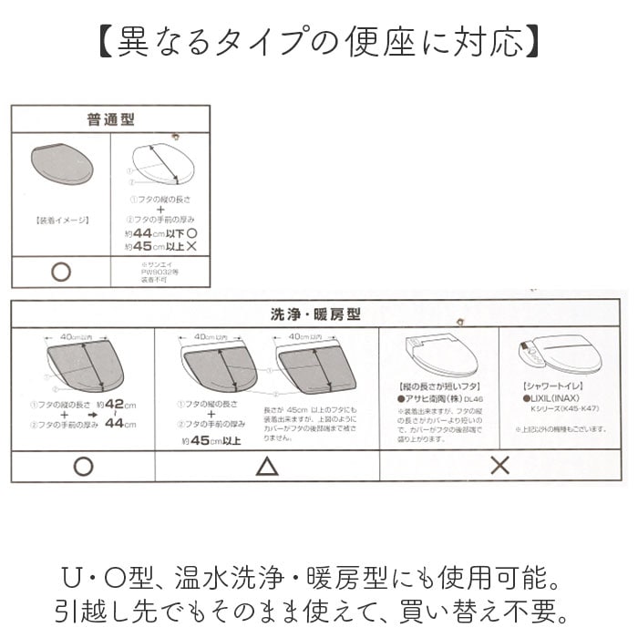 | サイズ | 【トイレマット】 [縦]約55cm/[横]約60cm 【フタカバー】 [普通型] フタの縦の長さ+フタの手前の厚みが、約44cm以下に適応。 [洗浄・暖房型] フタの横の長さが40cm以内/フタの縦の長さ+フタの手前の厚みが約45cm以上に適応。 ※サイズはメーカー公表サイズです。実際の商品とは多少の誤差が生じる場合がございます。あらかじめご了承ください。 【ペーパーホルダーカバー】 ・標準的なサイズのペーパーホルダーにお使いいただけます。 |