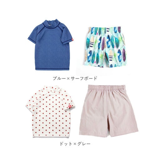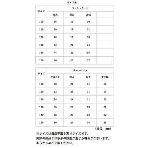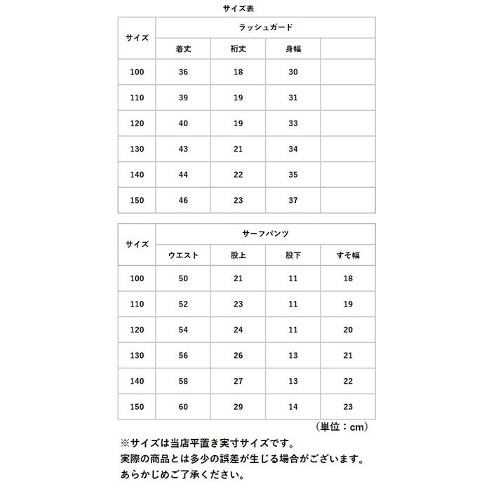 | 重量 | 【ラッシュガード】 約79g(※120cmの商品の重量です。) 【サーフパンツ】 約87g(※120cmの商品の重量です。) |
