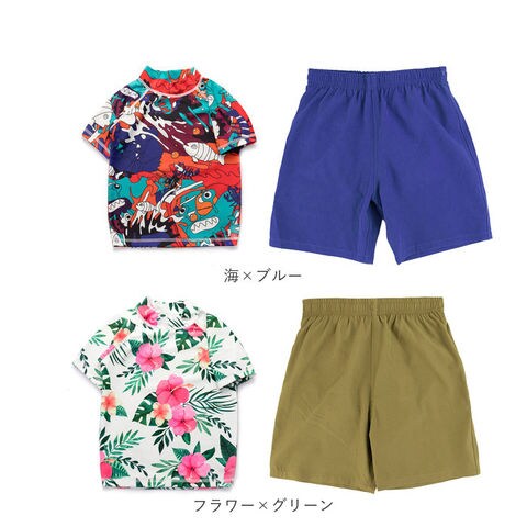 キッズ水着二点セット ユニセックス ykmms908set2【フラワー×グリーン】【110cm】