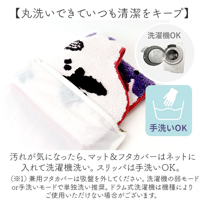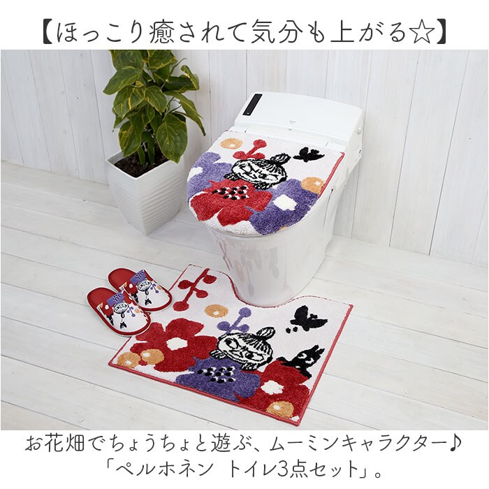 | 商品説明 | 【ほっこり癒されて気分も上がる☆】お花畑でちょうちょと遊ぶ、ムーミンキャラクター♪「ペルホネン トイレ3点セット」。【立体感のあるマット&フタカバー】太めの糸を使用し、毛足の長さに変化を。まるでムーミンたちが、絵本から飛び出してきたよう♪【繊細に表現したプリントデザイン】スリッパはさらりと心地よい質感の生地に、転写プリント。はっきりとした色合いと楽しい絵柄♪【丸洗いできていつも清潔をキープ】汚れが気になったら、マット&フタカバーはネットに入れて洗濯機洗い。スリッパは手洗いOK。(※1)兼用フタカバーは吸盤を外してください。マット&フタカバーは洗濯機の弱モードor手洗いモードで単独洗い推奨、ドラム式洗濯機は機種によりご使用いただけない場合がございます。【殺風景なトイレを明るく演出】空間に温かみをプラス。お気に入りのアイテムで、素敵にコーディネート♪≪トイレ足元マット≫【ふんわり快適な踏み心地も魅力】柔らかな質感のマットが、足裏を優しく受け止める◎素足でも抜群の肌触り。【2種類の質感&吸水速乾性も】背景はふんわりマイクロファイバー、キャラクターはサラッとパイル。水滴を吸水、乾きも速い!【ズレにくく、プチストレスを軽減】裏面にはドット状の滑りにくい加工済み。気になるズレを抑えて快適。≪兼用フタカバー≫【異なるタイプの便座に対応】U・O型、温水洗浄・暖房型にも使用可能。引越し先でもそのまま使えて、買い替え不要。【取り付け簡単!ピタッと吸着】吸盤を使用して装着。吸盤をしっかり固定できて、ぴったりフィット。(※2)便座タイプにより若干取り付け方法が異なります。≪スリッパ≫【柔らかく軽やかな履き心地】かかとに当たる部分に、もっちりクッションを内蔵。衝撃を吸収&軽量なつくりで疲れを軽減。 |