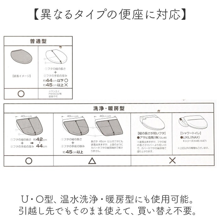 | サイズ | 【トイレマット】 [縦]約55cm/[横]約60cm 【フタカバー】 [普通型] フタの縦の長さ+フタの手前の厚みが、約44cm以下に適応。 [洗浄・暖房型] フタの横の長さが40cm以内/フタの縦の長さ+フタの手前の厚みが約45cm以上に適応。 ※サイズはメーカー公表サイズです。実際の商品とは多少の誤差が生じる場合がございます。あらかじめご了承ください。 【スリッパ】 【フリーサイズ】 [全長]約27cm ※サイズは当店計測の実寸サイズです。実際の商品ならびにメーカー表記サイズとは多少の誤差が生じる場合がございます。あらかじめご了承ください。 |