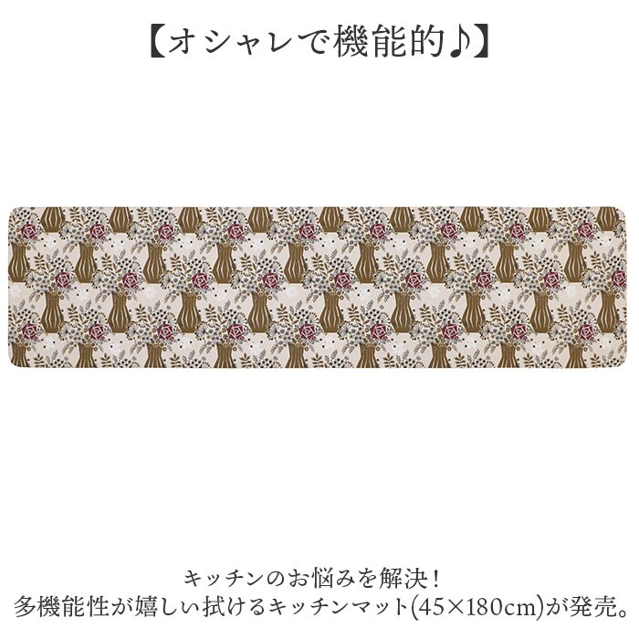 商品説明【オシャレで機能的♪】キッチンのお悩みを解決!多機能性が嬉しい拭けるキッチンマット(45×180cm)が発売。【サッとひと拭きで簡単キレイ】水や汚れに強い塩化ビニル素材。汚れても布巾などでサッとひと拭きするだけでキレイに。【水回りシーンでも安心な防カビ】水気が多い水回りシーンでも安心な防カビ効果で、敷きっぱなしでもカビの発生を抑えてくれる【抗菌防臭効果で衛生的】嬉しい抗菌防臭機能も付いており、菌の繁殖を抑えニオイも抑制!キッチンの足元を清潔に保つ【掃除機で埃などを吸い取れる】カーペットを掃除するように、掃除機でホコリやゴミも簡単オフ!お手入れがより簡単に完了。【足裏にやさしいクッション】程よい厚みとクッション性で、もちっとした踏み心地。長時間の立ち仕事でも足が疲れにくい。【床を傷や凹みからガード】足裏に優しいのはもちろん、物を落としても衝撃を吸収し、床を傷や傷凹みから守る。【引き出し掃除ロボにも干渉なし】ストレスなくキッチンの引き出しを使える厚さ。お掃除ロボットも乗り上げ可能☆【火を使うキッチンでも安全】万が一マットに着火した際でも燃え広がりにくい、防炎性と難燃性に優れた素材。【マット裏側は滑り止め加工済み】裏側に細かな凹凸加工を施しマットがズレにくく、小さなお子様やペットがいるご家庭でも安心【買い替え不要の床暖房対応】引っ越しの際の買い替えや、季節によっての使い分けも不要な床暖房対応タイプ。【トレーニングやヨガマットにも】ふんわり身体に優しいクッション性で、ご自宅でのプチ筋トレやヨガマットにも大活躍。