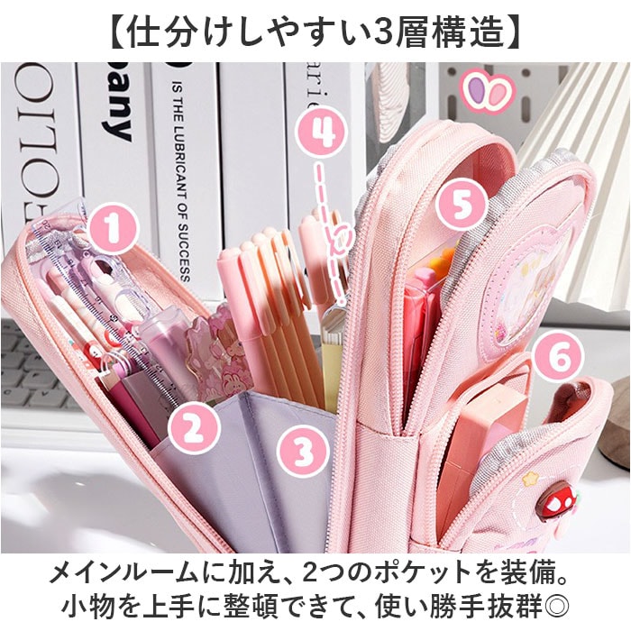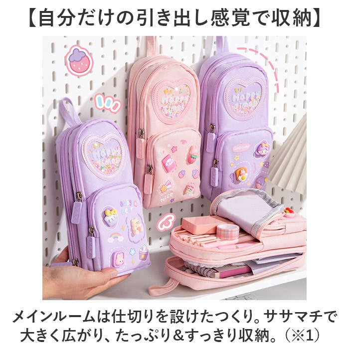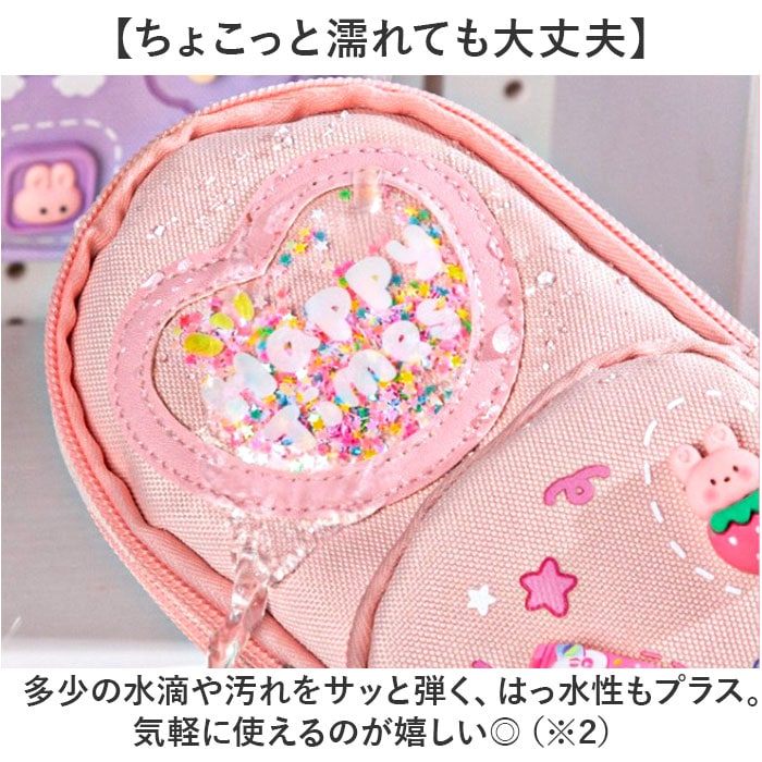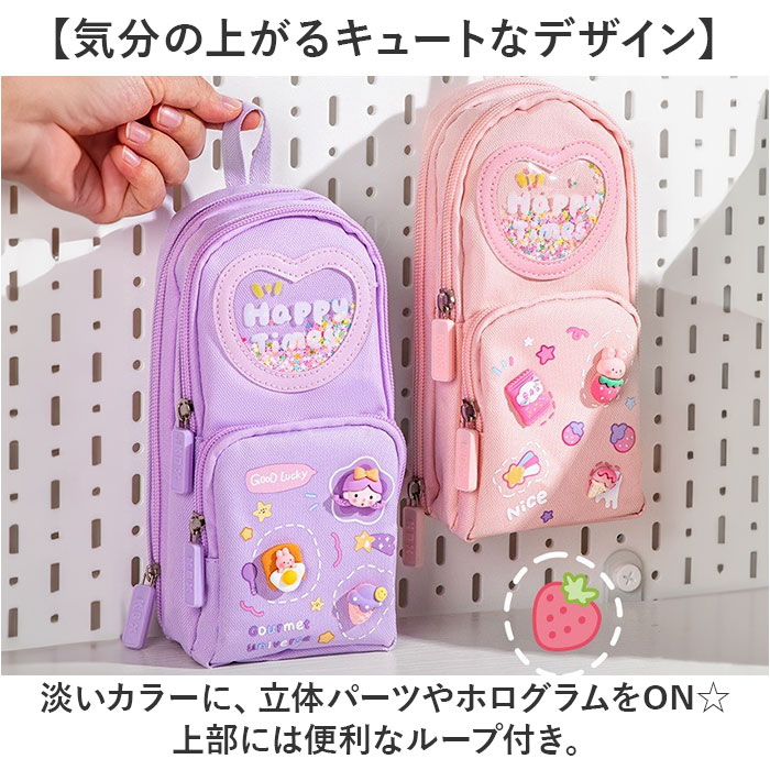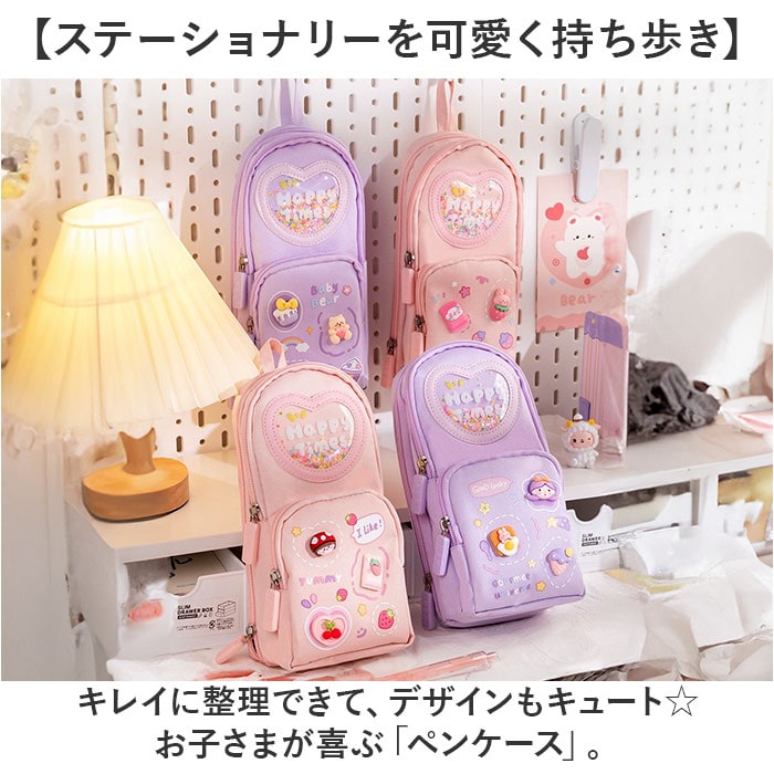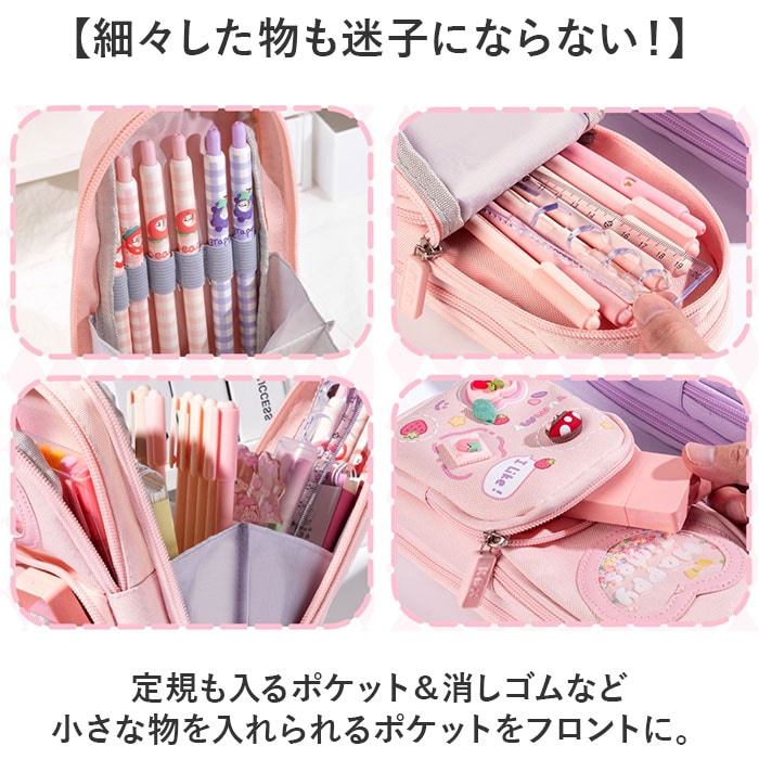 | 商品説明 | 【ステーショナリーを可愛く持ち歩き】キレイに整理できて、デザインもキュート☆お子さまが喜ぶ「ペンケース」。【仕分けしやすい3層構造】メインルームに加え、2つのポケットを装備。小物を上手に整頓できて、使い勝手抜群◎【ぐるっと開いて出し入れスムーズ】全てラウンド型に大きくオープン。中身を確認しやすく、取り出しも手間取らない!【自分だけの引き出し感覚で収納】メインルームは仕切りを設けたつくり。ササマチで大きく広がり、たっぷり&すっきり収納。(※1)ペンホルダー&ポケット付きです。【細々した物も迷子にならない!】定規も入るポケット&消しゴムなど小さな物を入れられるポケットをフロントに。【ちょこっと濡れても大丈夫】多少の水滴や汚れをサッと弾く、はっ水性もプラス。気軽に使えるのが嬉しい◎(※2)防水仕様ではありません。【気分の上がるキュートなデザイン】淡いカラーに、立体パーツやホログラムをON☆上部には便利なループ付き。【ポケット仕様】メインルーム内側:ペンホルダー×6、メッシュポケット×1前面:オープンポケット×2 |