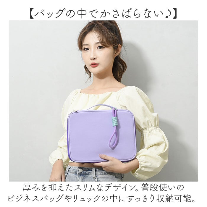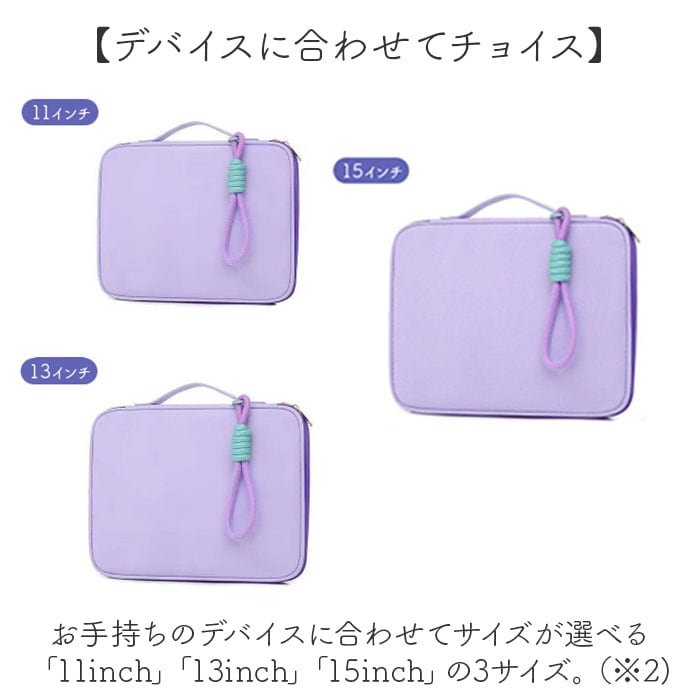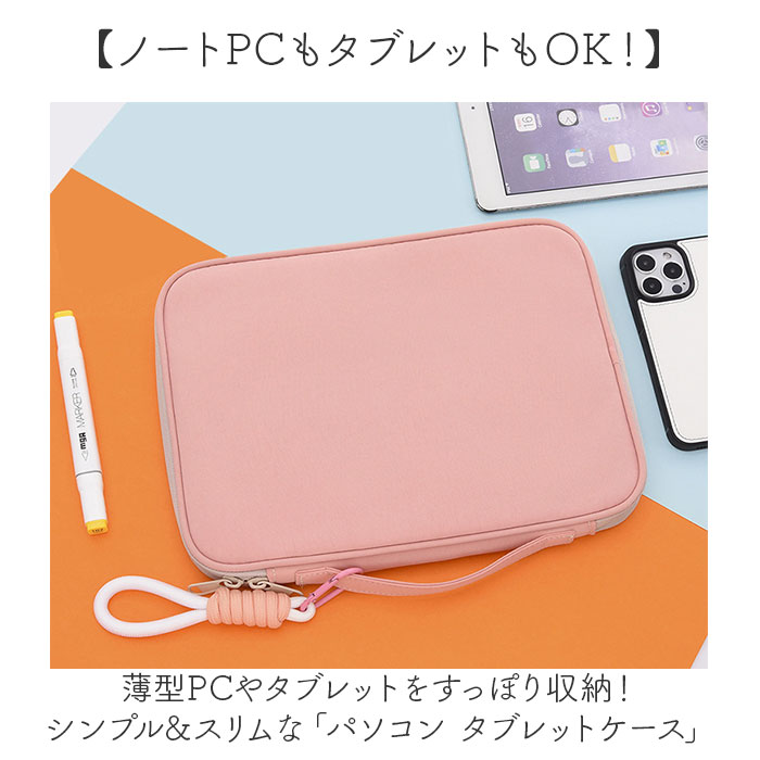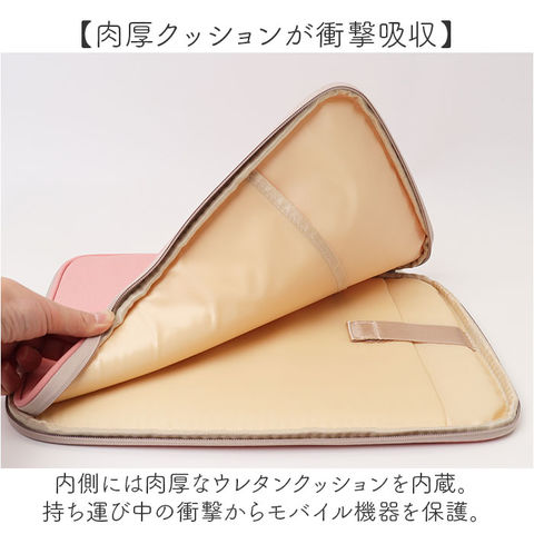| 商品説明 | 【ノートPCもタブレットもOK!】薄型PCやタブレットをすっぽり収納!シンプル&スリムな「パソコン タブレットケース」【バッグの中でかさばらない♪】厚みを抑えたスリムなデザイン。普段使いのビジネスバッグやリュックの中にすっきり収納可能。【機器の取り出しがスムーズ】開口部は側面まで大きく開くダブルファスナーを採用し、PCやタブレットの取り出しがスムーズ。【肉厚クッションが衝撃吸収】内側には肉厚なウレタンクッションを内蔵。持ち運び中の衝撃からモバイル機器を保護。【便利なポケット】イヤホンや電源ケーブルなど周辺機器をまとめて収納できるファスナーポケット付き。【ペン差しループ付き】メインルームの中央に、ボールペンやタブレットペンを収納できるペン差しループも搭載。【手提げ&ストラップの2WAY】サイドに持ち手付きだからバッグ単体で持ち運びOK!カラビナで取り外しできるストラップ付き。【雨の日も安心・はっ水加工】外側の生地ははっ水コーティング加工済み。雨粒を弾くので、雨の日の持ち歩きも安心!(※1)水滴がかかってから長時間そのままにしておくと、水が染みこむことがございます。濡れたらすぐに乾いた布で拭き取るようにしてください。【デバイスに合わせてチョイス】お手持ちのデバイスに合わせてサイズが選べる「11inch」「13inch」「15inch」の3サイズ。(※2)お手持ちの機器のサイズをよくご確認の上、ご購入ください。【合わせやすいシンプルカラー】配色がおしゃれなベーシック&かわいいパステルカラーを中心にラインナップ。 |