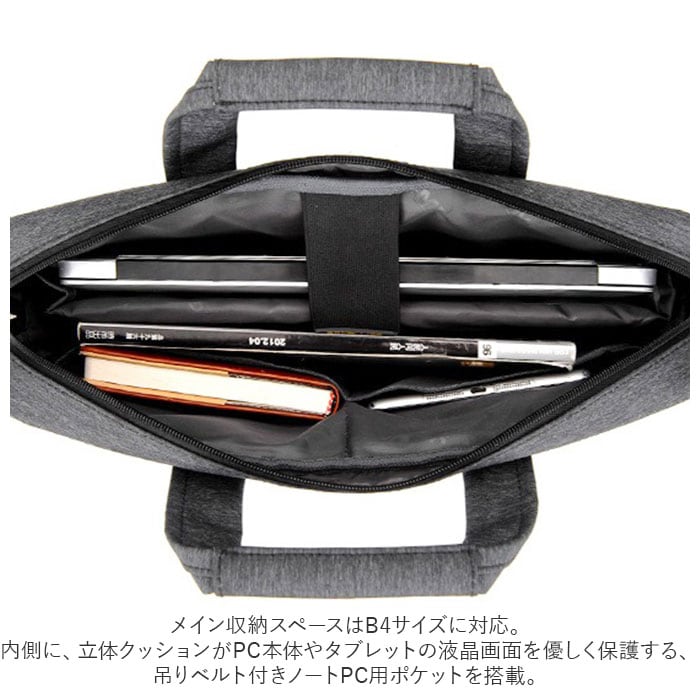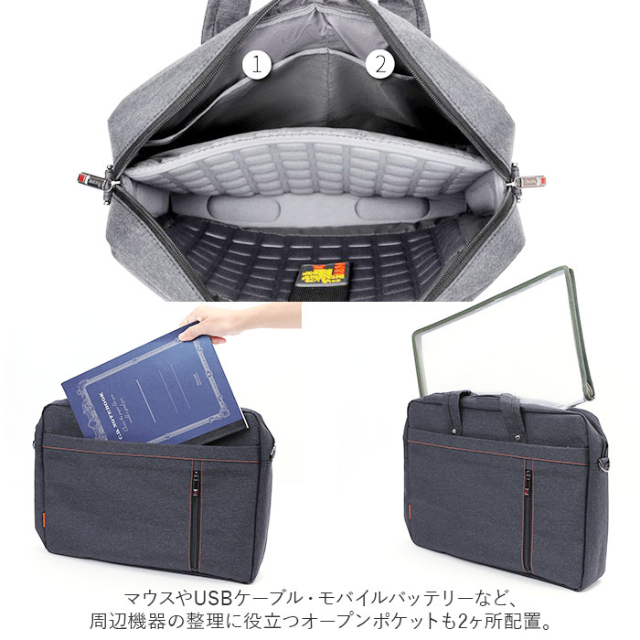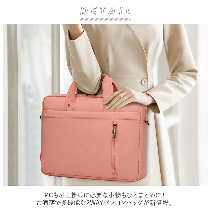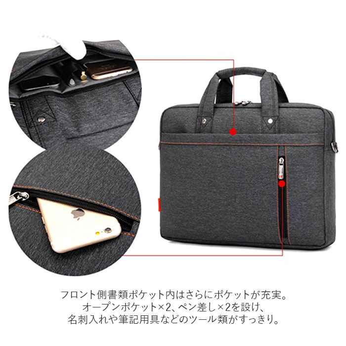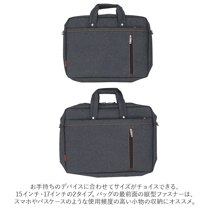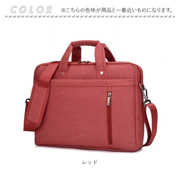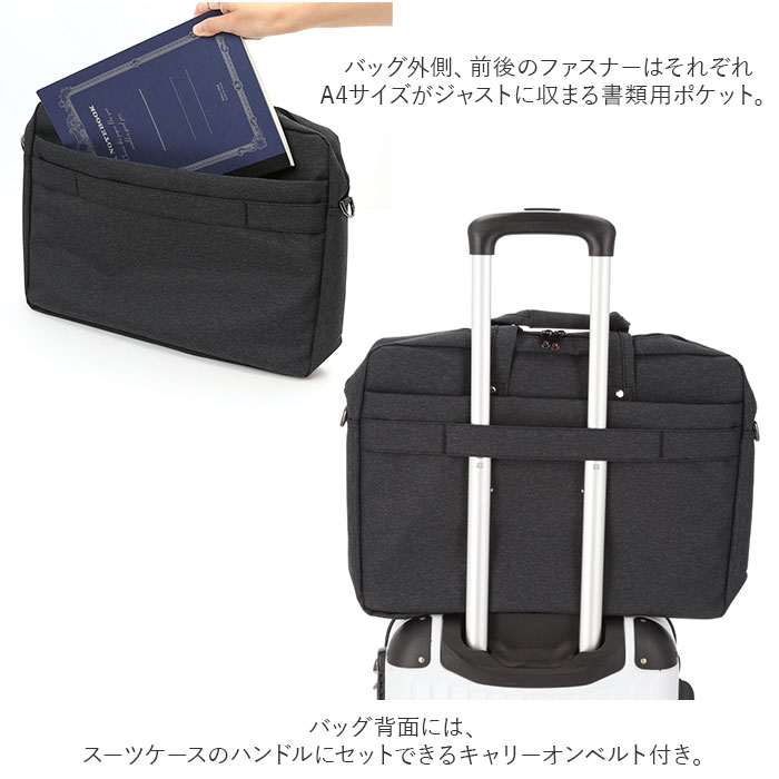 | 商品説明 | PCもお出掛けに必要な小物もひとまとめに!お洒落で多機能な2WAYパソコンバッグが新登場。薄型のラップトップやタブレットがすっぽりと収納できる、スリムなフォルムとクッション性を兼ね備えたノートPC用バッグ。メインスペース開口部には、左右どちらからも開閉しやすいダブルファスナーを採用し、PCや小物の取り出しがスムーズ。メイン収納スペースはB4サイズに対応。内側に、立体クッションがPC本体やタブレットの液晶画面を優しく保護する、吊りベルト付きノートPC用ポケットを搭載。マウスやUSBケーブル・モバイルバッテリーなど、周辺機器の整理に役立つオープンポケットも2ヶ所配置。バッグ外側、前後のファスナーはそれぞれA4サイズがジャストに収まる書類用ポケット。フロント側書類ポケット内はさらにポケットが充実。オープンポケット×2、ペン差し×2を設け、名刺入れや筆記用具などのツール類がすっきり。バッグの最前面の縦型ファスナーは、スマホやパスケースのような使用頻度の高い小物の収納にオススメ。取り外し可能なショルダーベルトで肩掛けにもできる2WAY仕様。クッションパッド付きベルトがPCの重さを程よく軽減し、持ち運びラクラク。バッグ背面には、スーツケースのハンドルにセットできるキャリーオンベルト付き。お手持ちのデバイスに合わせてサイズがチョイスできる、15インチ・17インチの2タイプ。表面生地に撥水加工を施しているから、急な雨でも安心。(※完全防水ではありません。)ビジネススタイルにフィットするベーシックカラーはもちろん、ファッションに華やかさを添えるビビッドカラーまで、バリエーション豊富にラインナップ。 |