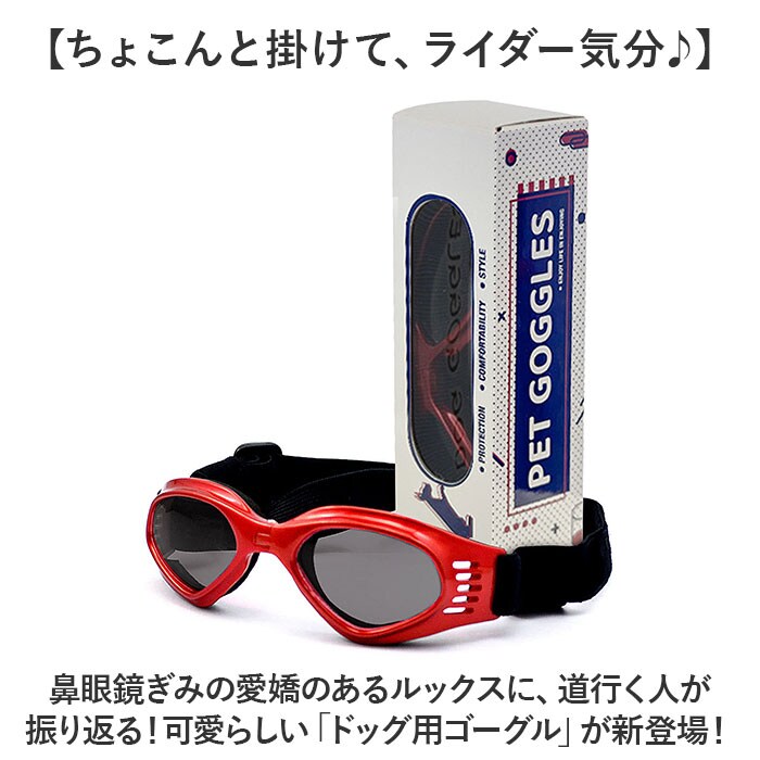 | 商品説明 | 【ちょこんと掛けて、ライダー気分♪】鼻眼鏡ぎみの愛嬌のあるルックスに、道行く人が振り返る!可愛らしい「ドッグ用ゴーグル」が新登場!【愛犬の目を強い日射しからガード】スタイリッシュなサングラスのようなカラーレンズ仕様で、日射しやホコリから愛犬の目を保護!【ワンちゃんのお顔にフィット】中央のブリッジ部分で軽く折りたためるので、ワンちゃんの額のカーブにピタッと優しくフィット。【柔らかクッションで痛くない】レンズ周囲のお顔に当たる部分は柔らかスポンジで縁取り、ワンちゃんが嫌がらない優しい感触。【曇りのないクリアな視界】左右のレンズ外側にはスリット状の通気孔を設け、着用中にレンズが曇らず、視界はいつでもクリア。【ズレ落ちないダブルベルト仕様】ぐーんと伸びる2本のゴムベルトが後頭部とアゴ下にフィットして、お散歩中もズレ落ちない安心仕様。【小型犬~中型犬にぴったりサイズ】・2本のゴムベルトはどちらもバックルで長さ調整が可能。サイズ感が合えば猫ちゃんも着けられる♪【小さくたたんでコンパクトに】ブリッジ部を折りたたむとコロンと小さな手のひらサイズになるので、持ち歩きにもとっても便利。【可愛いだけじゃないペットグッズ】自転車のカゴやバイクのサイドカーに乗って飼い主さんとお出掛けするときにお洒落に掛けられる♪日射しケアだけでなく、ドライアイや粉塵対策にも効果的。 |