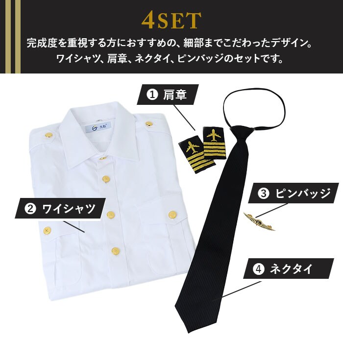 | 商品説明 | 【なりきり度MAXの本格仕様!】憧れのパイロット気分を、気軽に楽しめる「パイロットシャツ 制服 コスプレ 飛行機釦」【小物まで揃った、完成度重視派に】細部までこだわったデザイン。肩章・ネクタイ・ピンバッジのセットが付属。【目を引くアクセントパーツ】フロントと肩のゴールドボタンがポイント。肩章&ピンバッジでリアル感UP、写真映えも◎(※)肩章のラインはランダムになっておりますので、お選びいただけません。【手軽に着こなせる工夫あり!】ネクタイはファスナー式で着脱簡単。締め具合も調節できる便利仕様。【選べる袖タイプとサイズ展開】半袖・長袖の2タイプ。サイズも豊富で自分にぴったりが見つかる!【シーンを選ばず活躍!】クセのないデザインだから、演劇やイベント、コスプレなど幅広く使える万能アイテム。 |