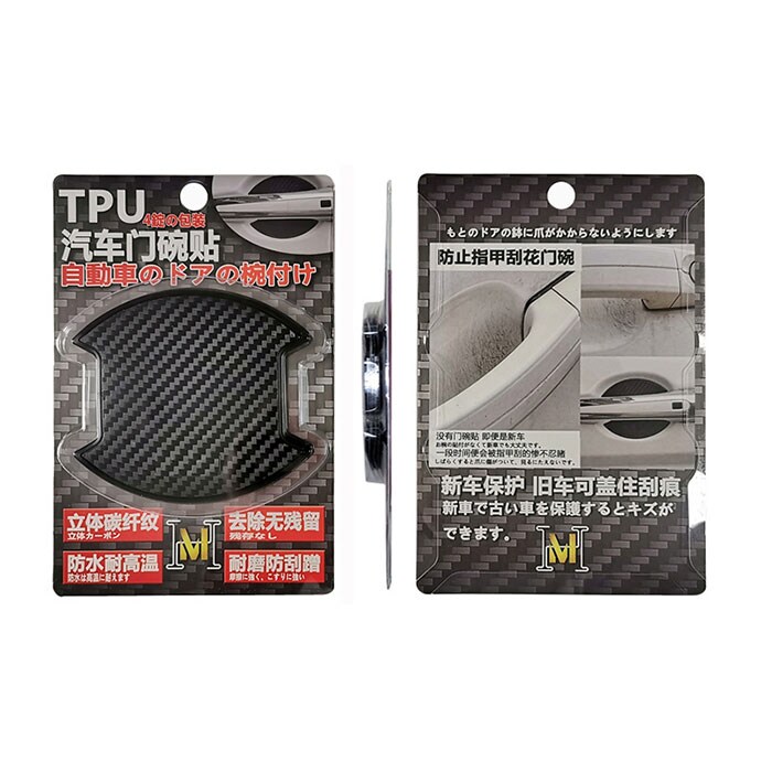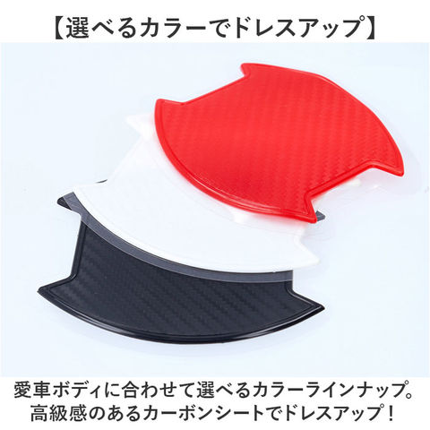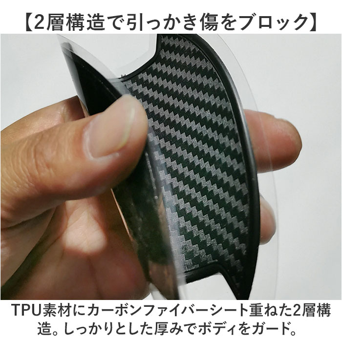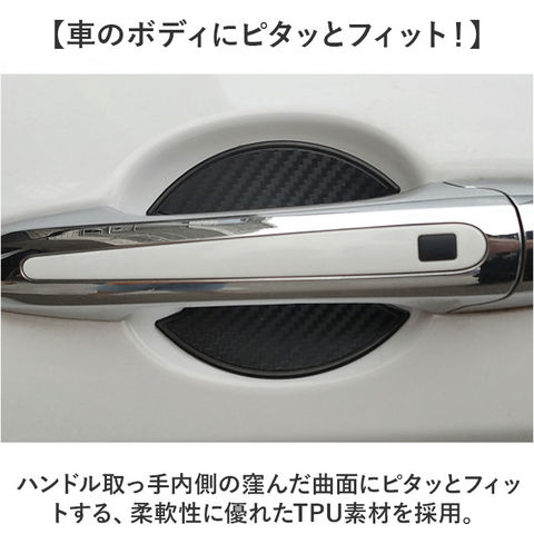 | 商品説明 | 【ハンドル周りのキズ防止に】自動車ドアハンドル周りのボディをツメ傷から保護!「ドアハンドルプロテクター 4枚セット」。【車のボディにピタッとフィット!】ハンドル取っ手内側の窪んだ曲面にピタッとフィットする、柔軟性に優れたTPU素材を採用。【2層構造で引っかき傷をブロック】TPU素材にカーボンファイバーシート重ねた2層構造。しっかりとした厚みでボディをガード。【ペタッと貼るだけ!簡単装着】プロテクター裏面の剥離シールをはがしたら、ハンドル内側の窪みに貼り付けるだけの簡単装着。【さまざまな車種に対応】汎用性の高い「90mm×105mm」サイズで、様々な車種のボディに取り付け可能。【全てのハンドル周りをまとめて保護】運転席と助手席、左右の後部座席側まで、全てのドア周りをまとめて保護できる嬉しい4枚セット。【選べるカラーでドレスアップ】愛車ボディに合わせて選べるカラーラインナップ。高級感のあるカーボンシートでドレスアップ! |