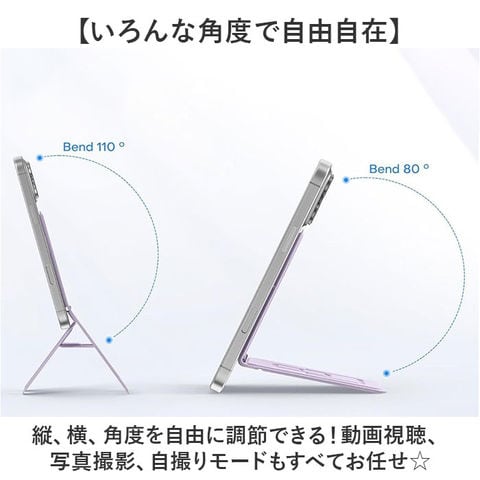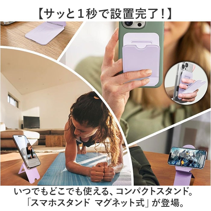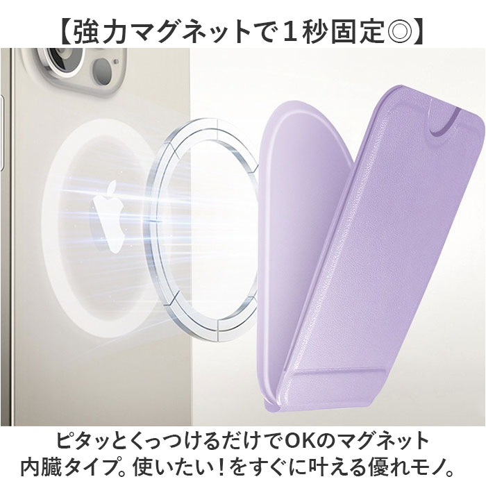 | 商品説明 | 【サッと1秒で設置完了!】いつでもどこでも使える、コンパクトスタンド。「スマホスタンド マグネット式」が登場。【強力マグネットで1秒固定◎】ピタッとくっつけるだけでOKのマグネット内臓タイプ。使いたい!をすぐに叶える優れモノ。【いろんな角度で自由自在】縦、横、角度を自由に調節できる!動画視聴、写真撮影、自撮りモードもすべてお任せ☆【つけたまま操作もOK】スラップを指で挟めるから、握りやすさもUP。1日中つけたままでも問題なし!【カードサイズで持ち運びも◎】薄くコンパクトなので、毎日バッグに入れて持ち運びできちゃう!折り畳み式がGOOD。【シーンを選ばないシンプルさ】ビジネスや学校でも使える、シンプルデザインが嬉しいポイント。お好みカラーをチョイス。 |