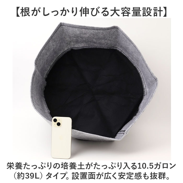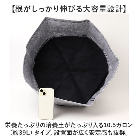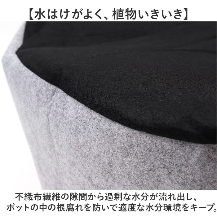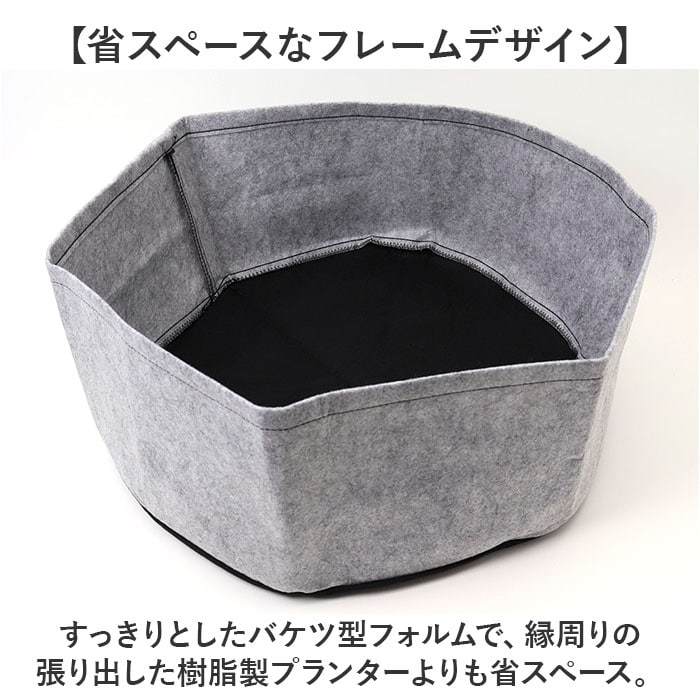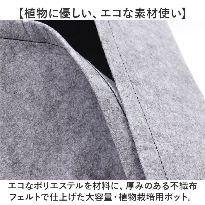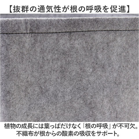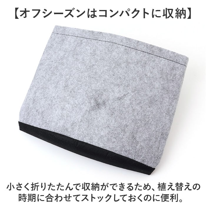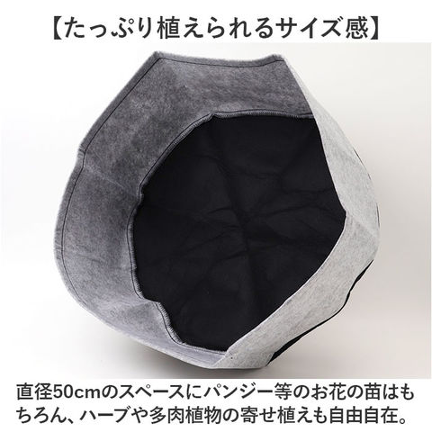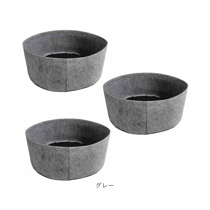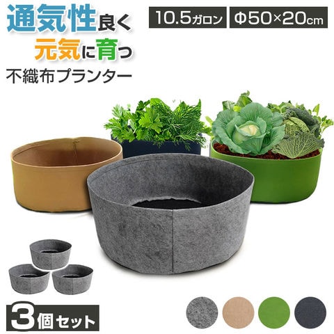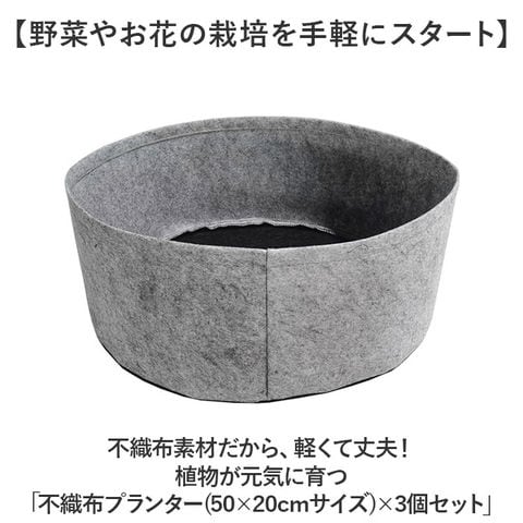 | 商品説明 | 【野菜やお花の栽培を手軽にスタート】不織布素材だから、軽くて丈夫!植物が元気に育つ「不織布プランター(50×20cmサイズ)×3個セット」【植物に優しい、エコな素材使い】エコなポリエステルを材料に、厚みのある不織布フェルトで仕上げた大容量・植物栽培用ポット。【水はけがよく、植物いきいき】不織布繊維の隙間から過剰な水分が流れ出し、ポットの中が根腐れせず適度な水分環境をキープ。【抜群の通気性が根の呼吸を促進】植物の成長には葉っぱだけなく「根の呼吸」が不可欠。不織布が根からの酸素の吸収をサポート。【省スペースなフレームデザイン】すっきりとしたバケツ型フォルムで、縁周りの張り出した樹脂製プランターよりも省スペース。【根がしっかり伸びる大容量設計】栄養たっぷりの培養土がたっぷり入る10.5ガロン(約39L)タイプ。設置面が広く安定感も抜群。【たっぷり植えられるサイズ感】直径50cmのスペースにパンジー等のお花の苗はもちろん、ハーブや多肉植物の寄せ植えも自由自在。【あこがれの家庭菜園を手軽に実現】トマトや葉物野菜などの苗を植えて、お庭やベランダでミニ家庭菜園を楽しみたい方にもオススメ。【オフシーズンはコンパクトに収納】小さく折りたたんで収納ができるため、植え替えの時期に合わせてストックしておくのに便利。【使い終わるまで、環境に優しい】樹脂製ポットよりも環境負荷の小さなエコプロダクト!使い終わったら可燃ゴミとして処分が可能。【緑のある暮らしを素敵に楽しむ】底面は泥汚れの目立たない黒色で統一。植物のグリーンが引き立つシンプルカラーをラインナップ。 |