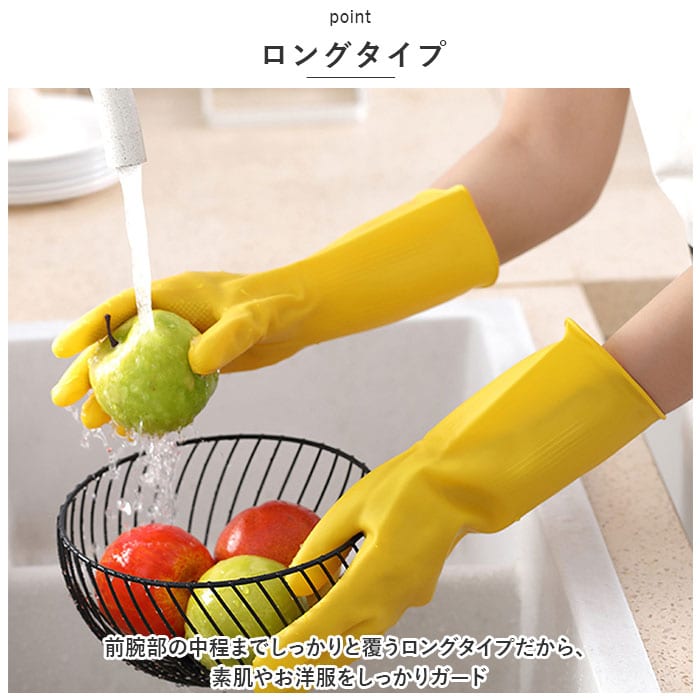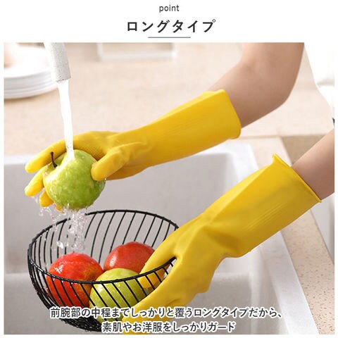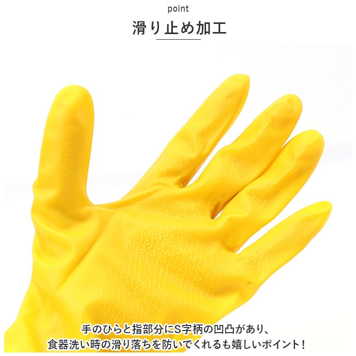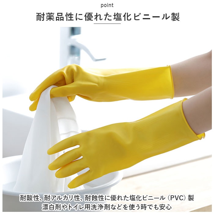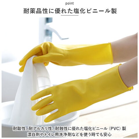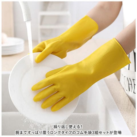 | 商品説明 | 繰り返し使える!腕まですっぽり覆うロングタイプのゴム手袋3組セットが登場。【ロングタイプ】前腕部の中程までしっかりと覆うロングタイプだから、素肌やお洋服をしっかりガード。【耐薬品性に優れた塩化ビニール製】耐酸性、耐アルカリ性、耐蝕性に優れた塩化ビニール(PVC)製。漂白剤やトイレ用洗浄剤などを使う時でも安心。【滑り止め加工】手のひらと指部分にS字柄の凹凸があり、食器洗い時の滑り落ちを防いでくれるも嬉しいポイント!【繰り返し使えて経済的】丈夫なので繰り返し使えて経済的!また、伸縮性が良く着脱もスムーズ! |