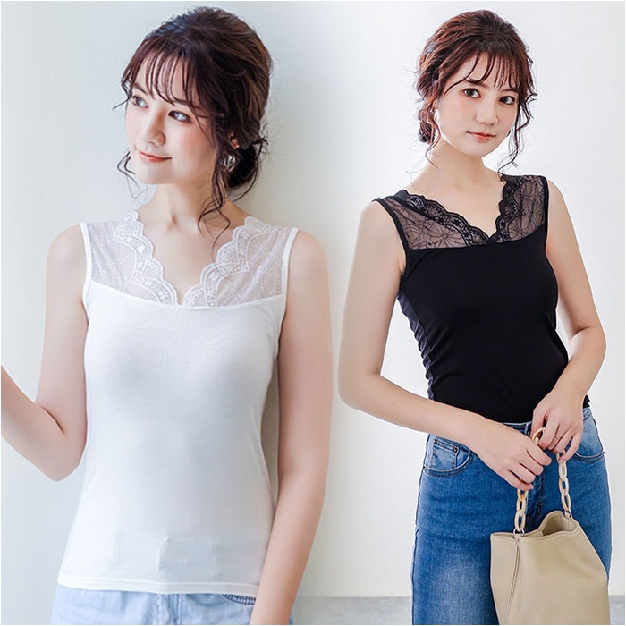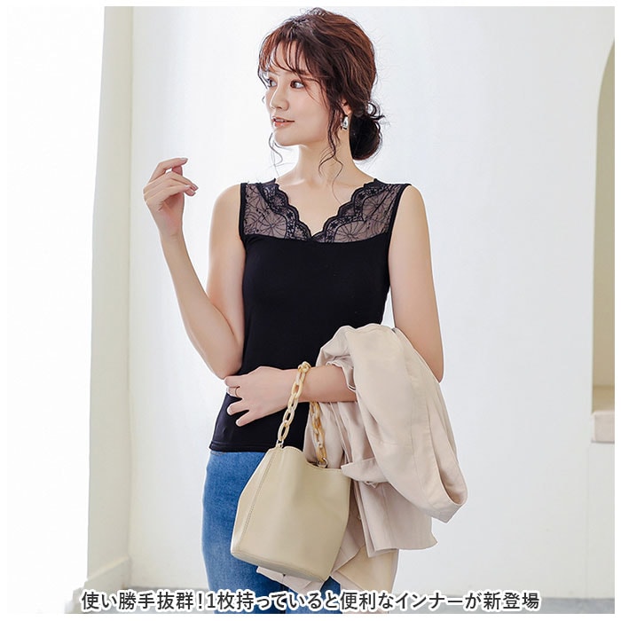 商品説明使い勝手抜群!1枚持っていると便利なインナーが新登場。【しっとり柔らかな生地感】素肌に触れても快適!滑らかな肌触りでオールシーズン活躍。【ストレッチ性も!】程よくストレッチ性があり、ボディラインに心地よくフィット。【トップスから見えてもおしゃれ】ショルダー&ネック部分は繊細なレースデザイン。オフショルダートップスから、チラッと見えても可愛い♪【着心地軽やか】幅広のショルダーストラップで食い込むことなく、肩に掛かる負担を軽減。【後ろ姿も抜かりなし】背面も上品な透け感があり、華やかな印象を演出。