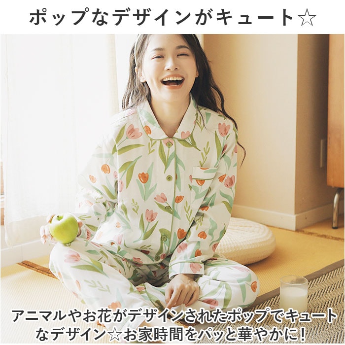 | 商品説明 | ポップなデザインでお家時間をもっとエンジョイ♪!パジャマが登場。【ポップなデザインがキュート☆】アニマルやお花がデザインされたポップでキュートなデザイン☆お家時間をパッと華やかに!【コットンを100%使用で柔らかい】コットンを100%使用した柔らかな着心地。素肌に触れても安心なのも嬉しいポイント。【締め付け感がなくラクチン】ゆったり設計で、締め付け感が少ない◎ウエストはゴム仕様で、寝ている間の動きを邪魔しない。【旅行やパジャマパーティーに】可愛いデザインなので、旅行やパジャマパーティーなどの大切なお泊りにぴったり☆【ロングシーズン使える生地感】ふんわり生地の長袖タイプなので、寒い季節から季節の変わり目までロングシーズン使用できる。 |