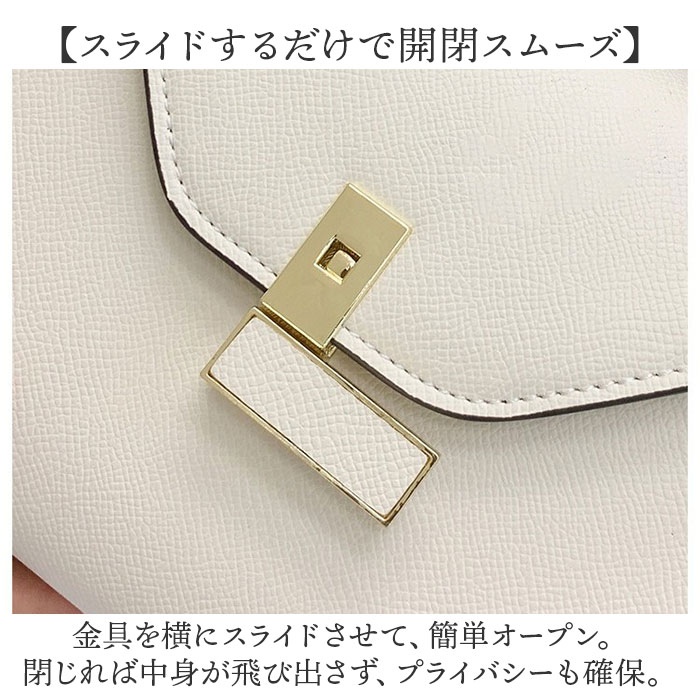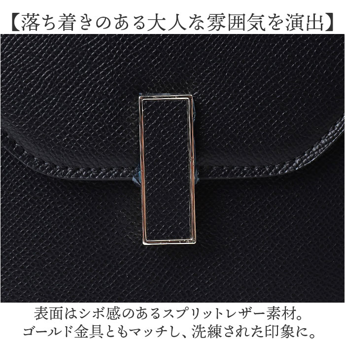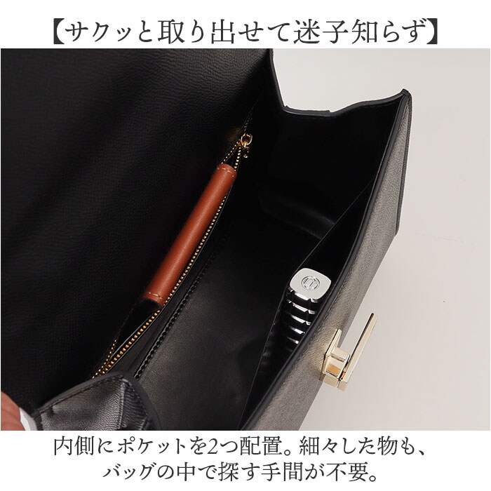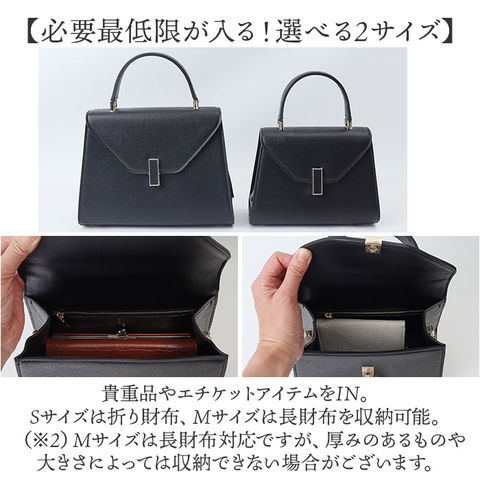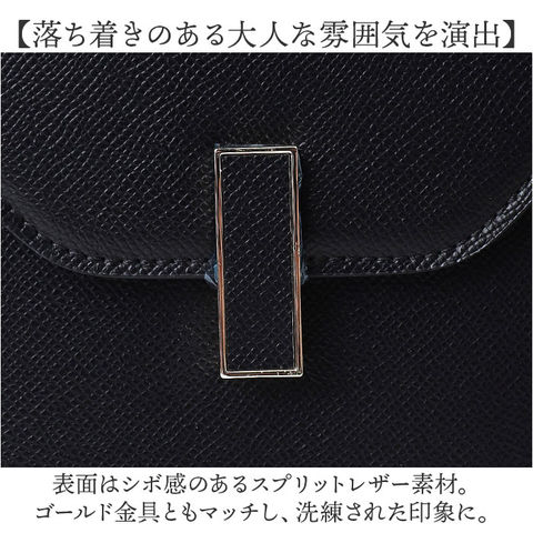 | 商品説明 | 【おしゃれに持ち歩ける相棒】普段おお出かけにも、オケージョンにもおすすめ。「ショルダー&ハンド2wayバッグ」。【落ち着きのある大人な雰囲気を演出】表面はシボ感のあるスプリットレザー素材。ゴールド金具ともマッチし、洗練された印象に。【お好みに合わせてスタイルチェンジ】手持ちで♪長さ調節可能なショルダーを取り付け、肩掛けや斜め掛けも自在な2wayタイプ。(※1)ショルダーストラップを取り付ける際は、金具を下にスライドして開きます。【スライドするだけで開閉スムーズ】金具を横にスライドさせて、簡単オープン。閉じれば中身が飛び出さず、プライバシーも確保。【必要最低限が入る!選べる2サイズ】貴重品やエチケットアイテムをIN。Sサイズは折り財布、Mサイズは長財布を収納可能。(※2)Mサイズは長財布対応ですが、厚みのあるものや大きさによっては収納できない場合がございます。【サクッと取り出せて迷子知らず】内側にポケットを2つ配置。細々した物も、バッグの中で探す手間が不要。【キレイなフォルムをキープ】型崩れしにくく、荷物を入れていない状態でも自立。荷物の出し入れもスマート。【底面の擦れを軽減して長持ち】底面四隅には、傷や汚れが付きにくい底鋲を装備。直置きも安心。【お気に入りを選べるカラー】ベーシックや差し色をライナップ。シーズンレスで、長く愛用できるアイテム。【ポケット仕様】内側:ファスナーポケット×1、オープンポケット×1 |