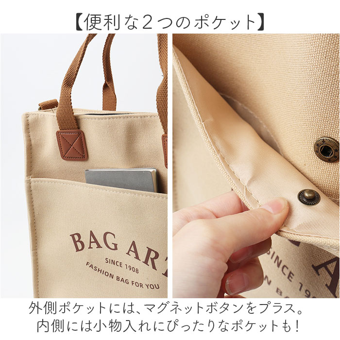 | 商品説明 | 【デイリーにぴったりな大容量♪】大人ナチュラルな可愛さが魅力の「トートバッグ 2WAYショルダーバッグ」が登場。【ザクザク入る縦型トート!】書類やタブレット、PCなどをザクザク収納できる縦型タイプ。ペットボトルやお弁当箱も入る◎【毎日使えるナチュラルデザイン】合わせる服装やシーンを問わない、大人シンプルなデザイン!丈夫なキャンバス生地で長く愛用♪【お好みで選べる2WAY仕様】トートとショルダーの2WAY仕様。ショルダー紐は取り外し可能&長さ調節OKで使いやすい。【垢ぬけデザインでおしゃれ度UP】ロゴデザインや、キャンバス生地×レザー調のアクセントでグッと垢ぬけるマストバイなバッグ。【安心のファスナーつき】荷物が見えない&飛び出さない安心のファスナーつき!通勤や通学、お出かけやレジャーに◎【便利な2つのポケット】外側ポケットには、マグネットボタンをプラス。内側には小物入れにぴったりなポケットも!【ポケット仕様】メイン収納:ファスナーポケット×1フロント:マグネットボタンポケット×1 |