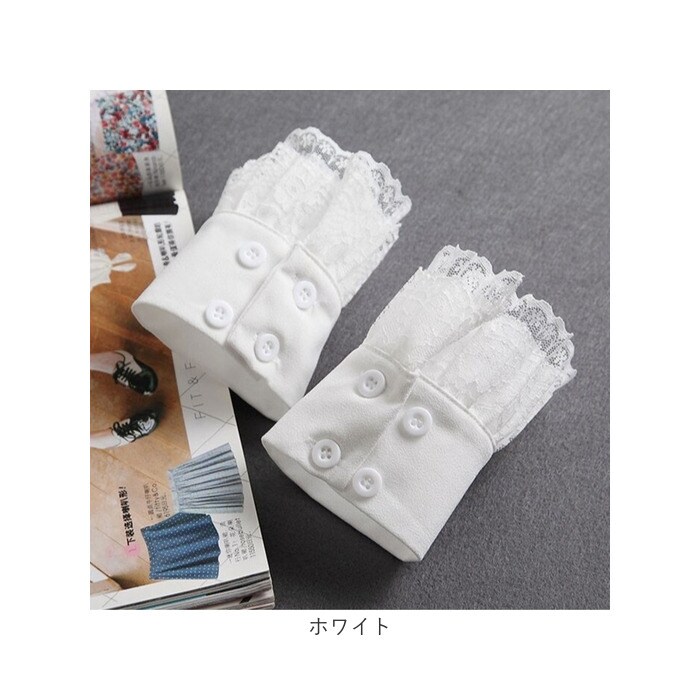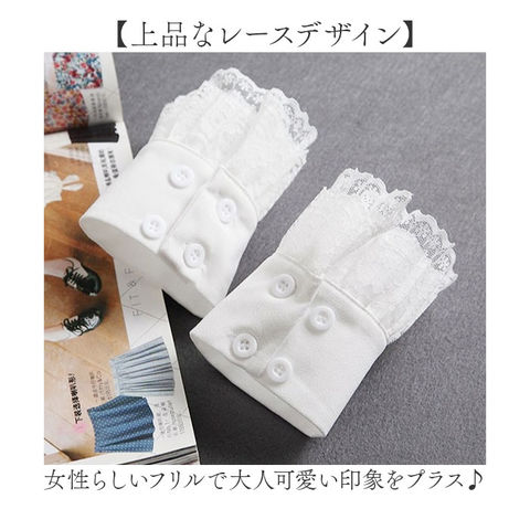 | 商品説明 | 【簡単コーデ力UP】袖からチラッとレースのフリルが見えておしゃれ♪【華やかさをプラス】セーターやパーカーに合わせるだけで印象が、がらりとチェンジ!【上品なレースデザイン】女性らしいフリルで大人可愛い印象をプラス♪【サイズ調節可能】ボタンでサイズ調節ができる〇【カジュアルに使える】シンプルカラーでどんなコーデにも合わせやすい◎※当店他ページにて、付け襟も販売しています。 |