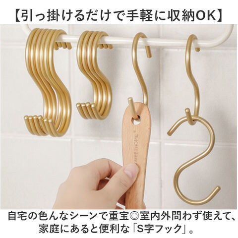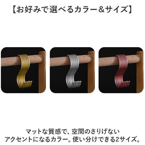 | 商品説明 | 【引っ掛けるだけで手軽に収納OK】自宅の色んなシーンで重宝◎室内外問わず使えて、家庭にあると便利な「S字フック」。【穴あけなど不要で上下関係なく活用】ライフハックツールの定番☆ポールや穴など、引っ掛けられる場所があれば大丈夫。【サビに強く軽くて丈夫なアルミ合金】軽量ながら使い勝手抜群◎お風呂グッズをまとめたカゴやプランターの吊り下げ、壁掛けにも!【散らかりがちなキッチンスペースで】ミトンやクロスの見せる収納♪突っ張り棒をセットして吊るせば、デッドスペースを有効活用。【バッグや帽子などもディスプレイ】置き場所に悩む小物もすっきり。見せる意識で吊るせば、ショップのような雰囲気に!【照明を吊るしたり使い方は自由】ランタンなどを引っ掛けたり、使い方は無限大。先端は滑らかで丸みがあり、傷つきをガード。【お好みで選べるカラー&サイズ】マットな質感で、空間のさりげないアクセントになるカラー。使い分けできる2サイズ。 |