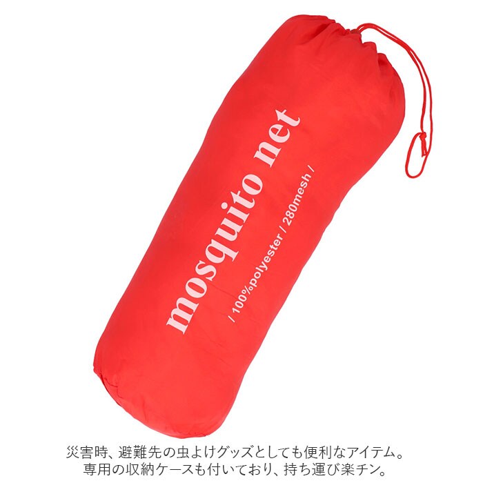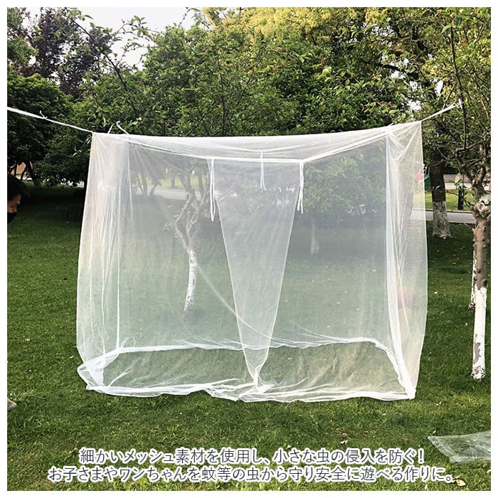 | 商品説明 | 吊るして使える蚊帳ネットが登場。細かいメッシュ素材を使用し、小さな虫の侵入を防ぐ!お子さまやワンちゃんを蚊等の虫から守り安全に遊べる作りに。工具の必要はなく、四隅のループを木の枝やポールに引っ掛けるだけの簡単取り付け♪アウトドアで使うのはもちろん、室内やお家のベランダでも使用可能♪災害時、避難先の虫よけグッズとしても便利なアイテム。専用の収納ケースも付いており、持ち運び楽チン。 |
