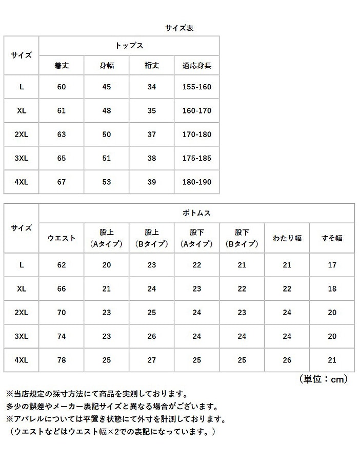 | サイズ | [メンズ] ・Lサイズ ・XLサイズ ・2XLサイズ ・3XLサイズ ・4XLサイズ ※サイズについて詳細は、商品画像の中にあるサイズ表をご覧くださいませ。 |