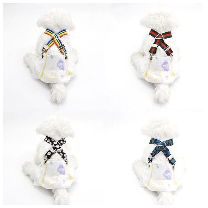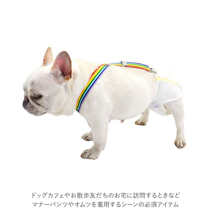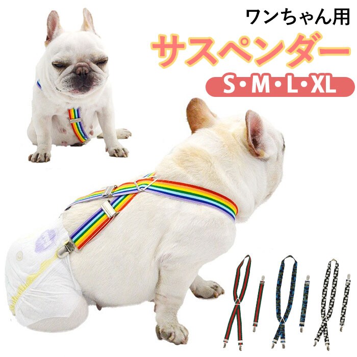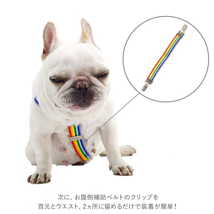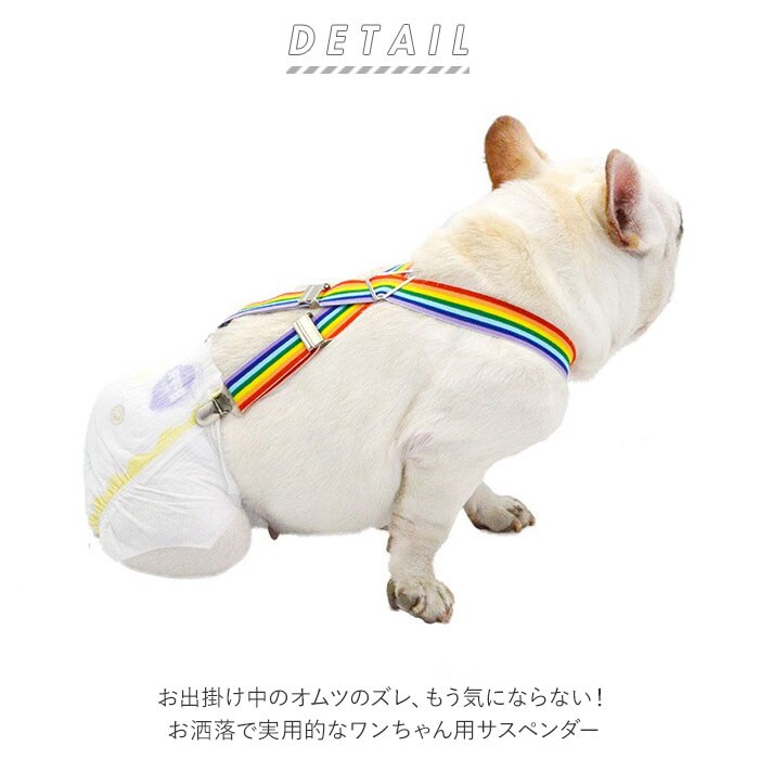 | 商品説明 | お出掛け中のオムツのズレ、もう気にならない!お洒落で実用的なワンちゃん用サスペンダー。ドッグカフェやお散歩友だちのお宅に訪問するときなど、マナーパンツやオムツを着用するシーンの必須アイテム。輪っかになったベルト部分をワンちゃんの首に掛けたら、背中側2ヵ所のクリップをオムツのウエストにパチンッ!次に、お腹側補助ベルトのクリップを、首元とウエスト、2ヵ所に留めるだけで装着が簡単!ワンちゃんの身体に負担のかからない、幅広2.5cmのゴムバンドを採用。クリップ内側には樹脂製の滑り止めを施し、バンドの外れを防いでオムツやマナーパンツをしっかりとホールド。3点のアジャスター金具で、ベルトの長さ調節も自在。アジャスター金具を取り外してベルト自体をカットすれば、よりぴったりサイズに!小型犬から大型犬まで、ワンちゃんの身体のサイズに合わせて選べる、S・M・L・XLの4種類をラインナップ。 |