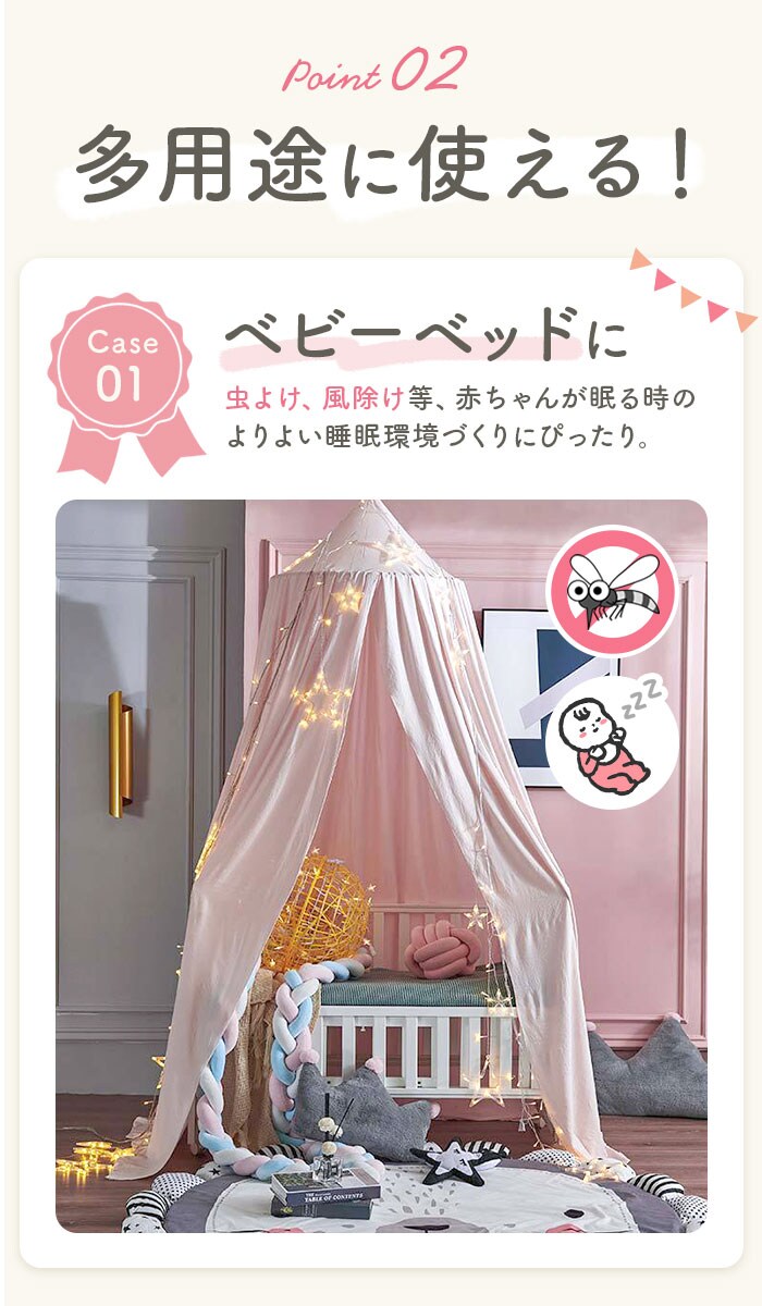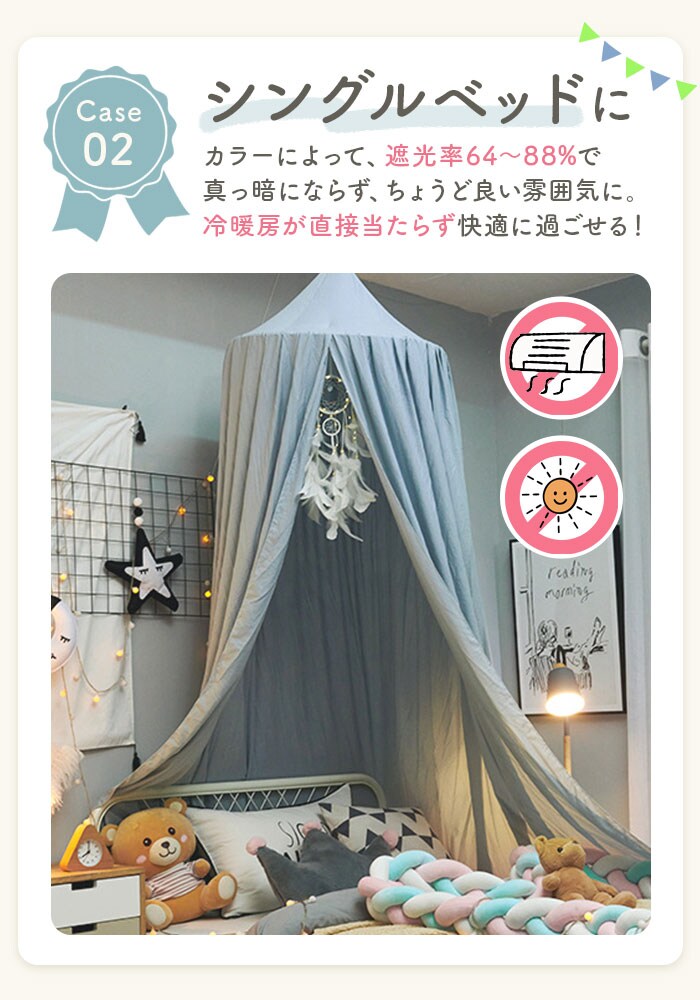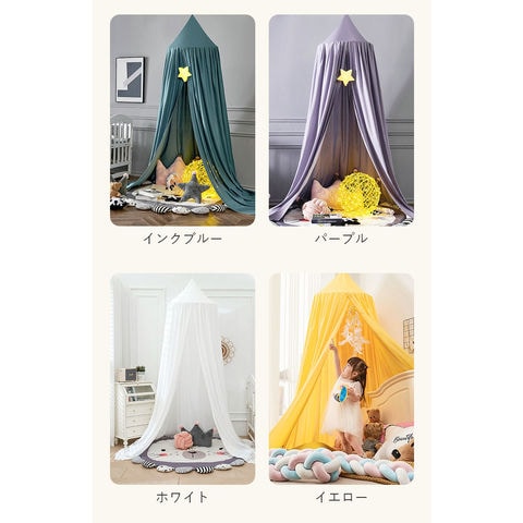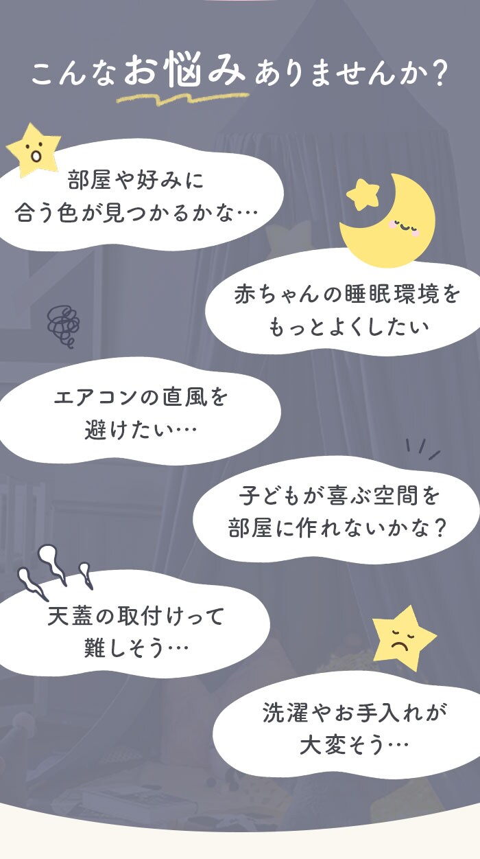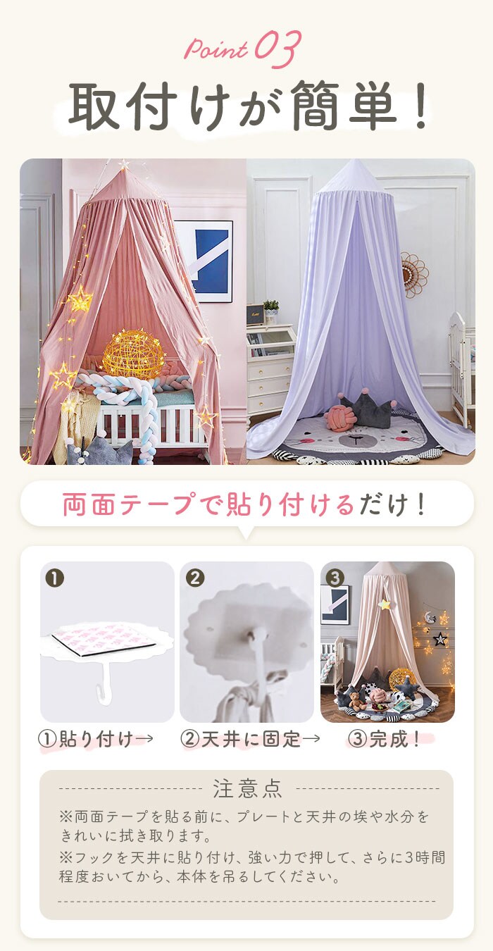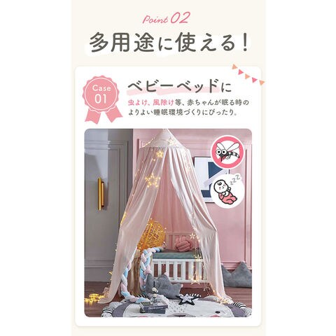 | 商品説明 | 吊るすだけで、ベッド周りを華やかに演出♪天蓋タイプで雰囲気たっぷり「スリーピングカーテン」が新登場。屋外の明かりや照明の光が強すぎる・・・。エアコンの風が直接当たって冷えが気になる・・・。お休みタイムのそんなお悩みは「スリーピングカーテン」解決!サークル型のワイヤーフレームから、カーテン生地の裾をたっぷりと伸ばしたオシャレな天蓋仕様。子ども部屋のベッドやプレイスペースに設置するだけで、おとぎ話のプリンセス気分♪ベビーベッドを覆うように取り付ければ、蚊など虫除け、エアコンの風除けとして、赤ちゃんのためのよりよい睡眠環境づくりに最適。巣ごもりタイムをゆったり過ごしたい、大人のプライベートスペースを確保したいときにも大活躍!横幅約1.5メートルのシングルベッドがすっぽり覆えるサイズ感。天蓋カーテンを天井から吊り下げるフック付き掛け具は、ネジや3M製の強力両面テープで誰でも簡単に設置が可能。汚れが気になった時は、洗濯ネットに入れてご家庭で手軽にお洗濯が可能。(※アイロンがけはお避けください。)出産祝い用のギフトや、お誕生日プレゼントにオススメ。 |