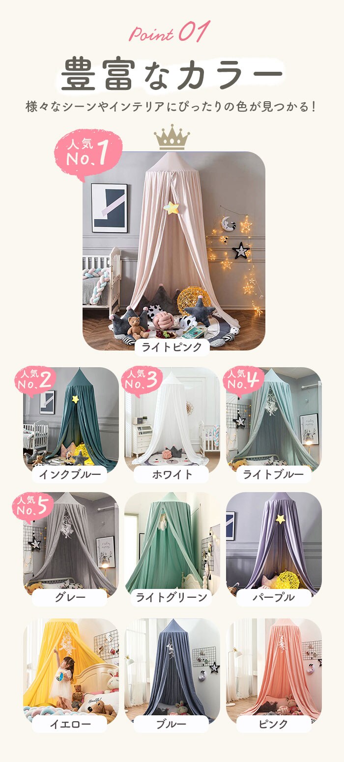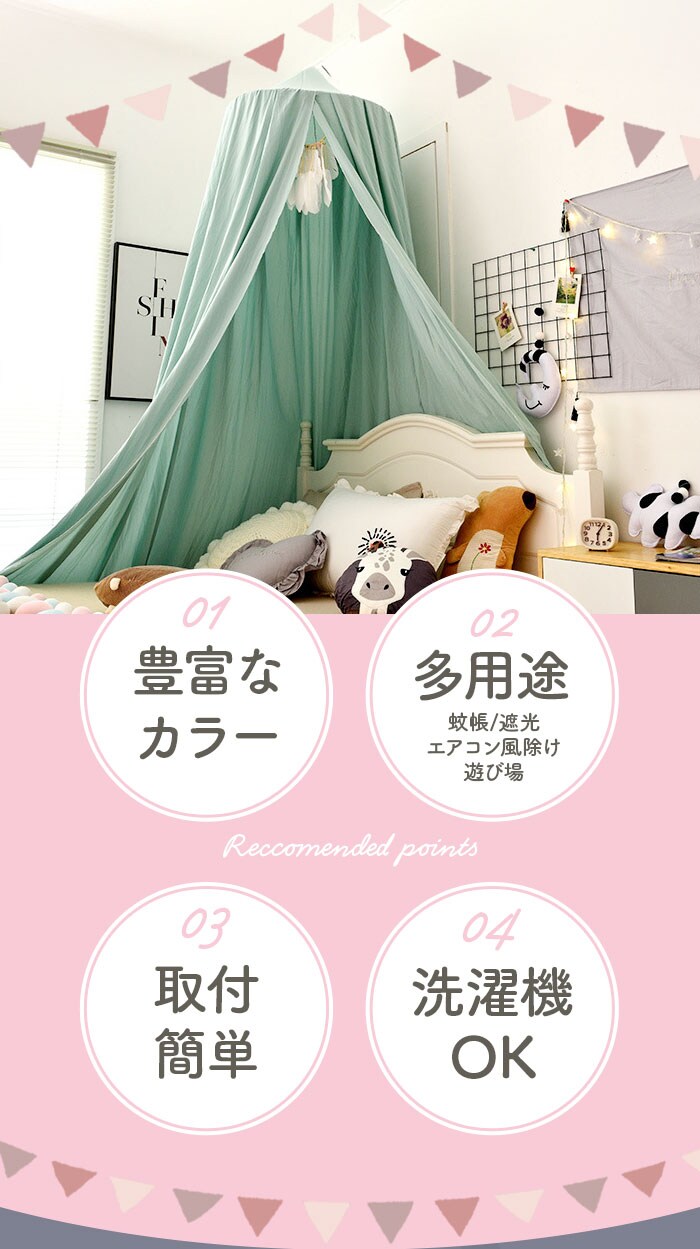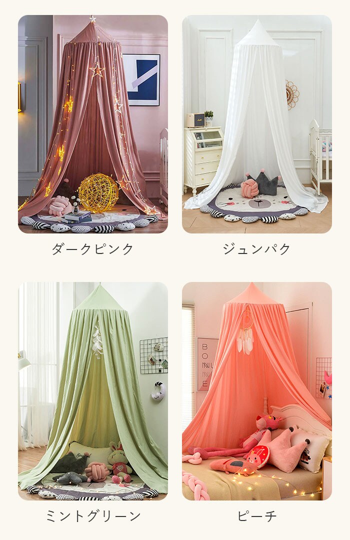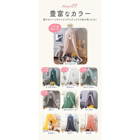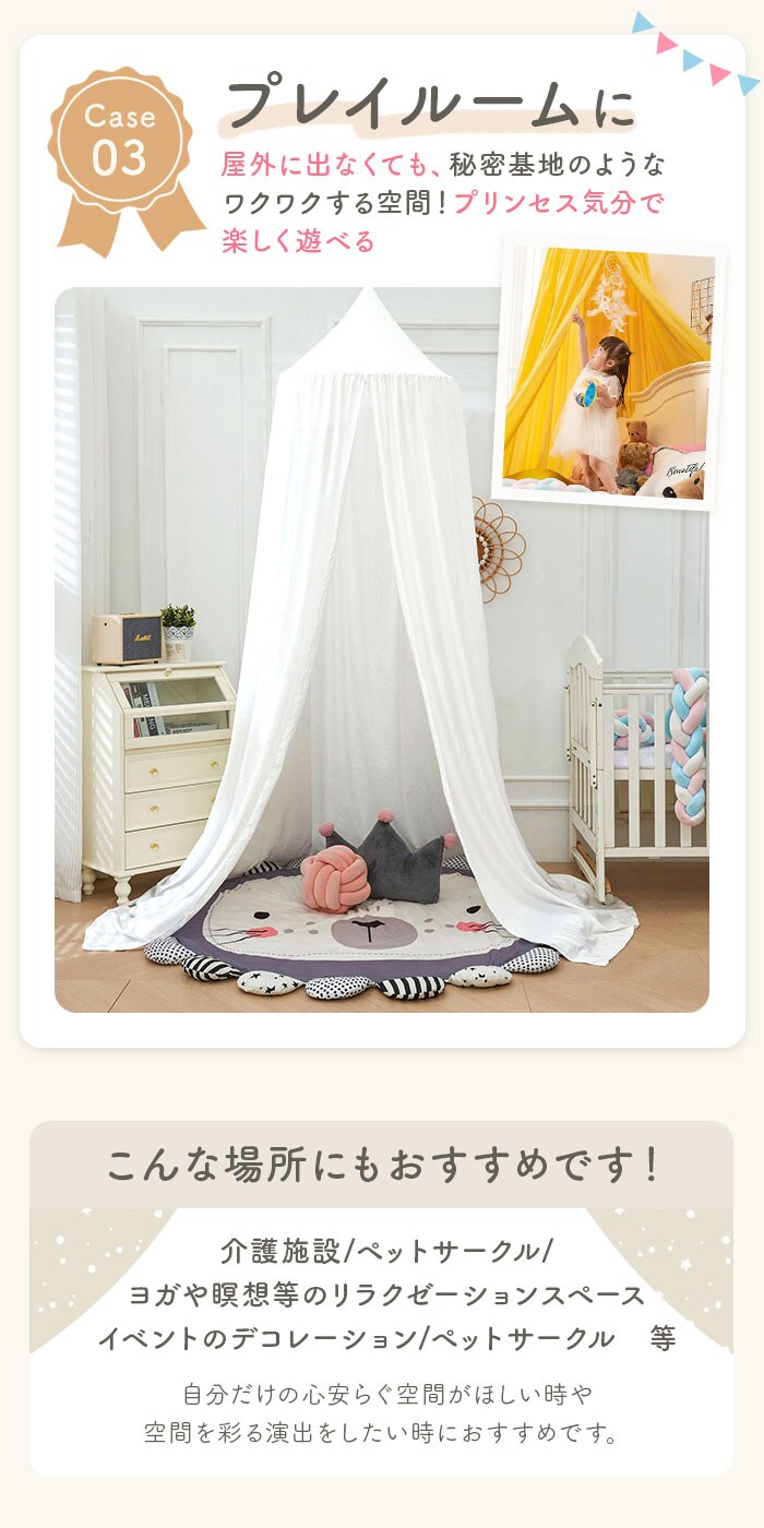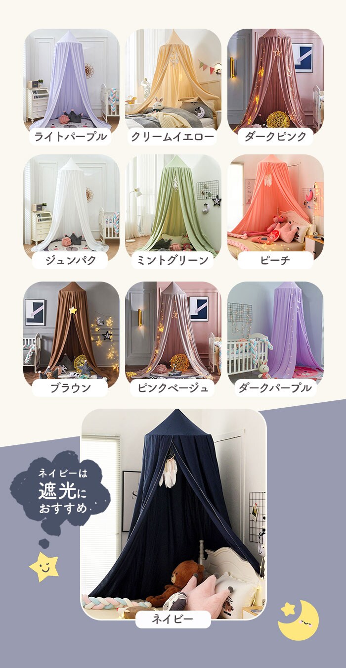 | 商品説明 | 吊るすだけで、ベッド周りを華やかに演出♪天蓋タイプで雰囲気たっぷり「スリーピングカーテン」が新登場。屋外の明かりや照明の光が強すぎる・・・。エアコンの風が直接当たって冷えが気になる・・・。お休みタイムのそんなお悩みは「スリーピングカーテン」解決!サークル型のワイヤーフレームから、カーテン生地の裾をたっぷりと伸ばしたオシャレな天蓋仕様。子ども部屋のベッドやプレイスペースに設置するだけで、おとぎ話のプリンセス気分♪ベビーベッドを覆うように取り付ければ、蚊など虫除け、エアコンの風除けとして、赤ちゃんのためのよりよい睡眠環境づくりに最適。巣ごもりタイムをゆったり過ごしたい、大人のプライベートスペースを確保したいときにも大活躍!横幅約1.5メートルのシングルベッドがすっぽり覆えるサイズ感。天蓋カーテンを天井から吊り下げるフック付き掛け具は、ネジや3M製の強力両面テープで誰でも簡単に設置が可能。汚れが気になった時は、洗濯ネットに入れてご家庭で手軽にお洗濯が可能。(※アイロンがけはお避けください。)出産祝い用のギフトや、お誕生日プレゼントにオススメ。 |
