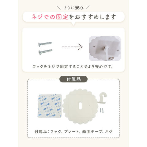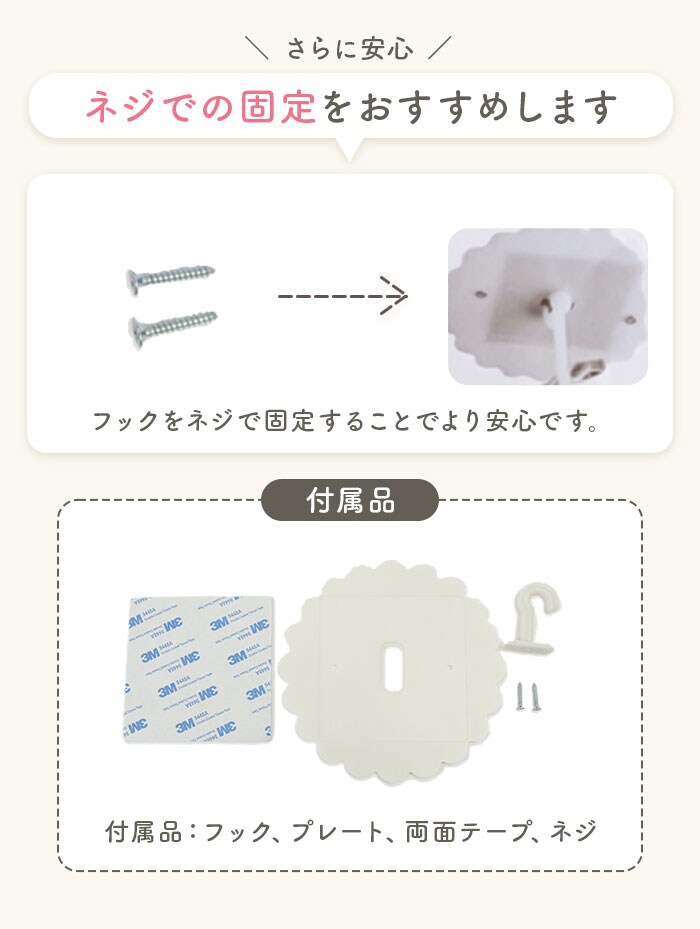 | 注意点 | [付属品]専用フック一式(フック、プレート、両面テープ)海外輸入品のため、商品によってはパッケージや説明書が、英語や中国語表記となっている場合があります。商品を安価でご提供させていただくため、輸入時のパッケージのままでのお届けとなります。予めご了承くださいませ。商品の写真はできる限り実物のお色に近づけるように加工しておりますが、お使いのモニター設定、お部屋の照明などにより、実際の商品と異なる場合がございます。商品や個体差などにより、表記と若干異なる場合がございますが、予めご了承くださいませ。輸入品のため、糸の継ぎ目や縫製等が甘い部分、糊跡等が生じる場合がございますが、予めご了承くださいませ。生地の特性上、やや匂いが強く感じられるものもございます。数日のご使用や陰干しなどで気になる匂いはほとんど感じられなくなります。お手入れなどはタグなどの表記をご確認ください。商品のタグなどのデザインは生産時期によって異なる場合がございます。配送の方法によっては、商品に多少のシワ等ができる場合がございますが、出来る限りお客様にリーズナブルな価格帯でご提供するためです。ご了承くださいませ。採寸方法の違いにより、多少の誤差がある場合がございます。 |